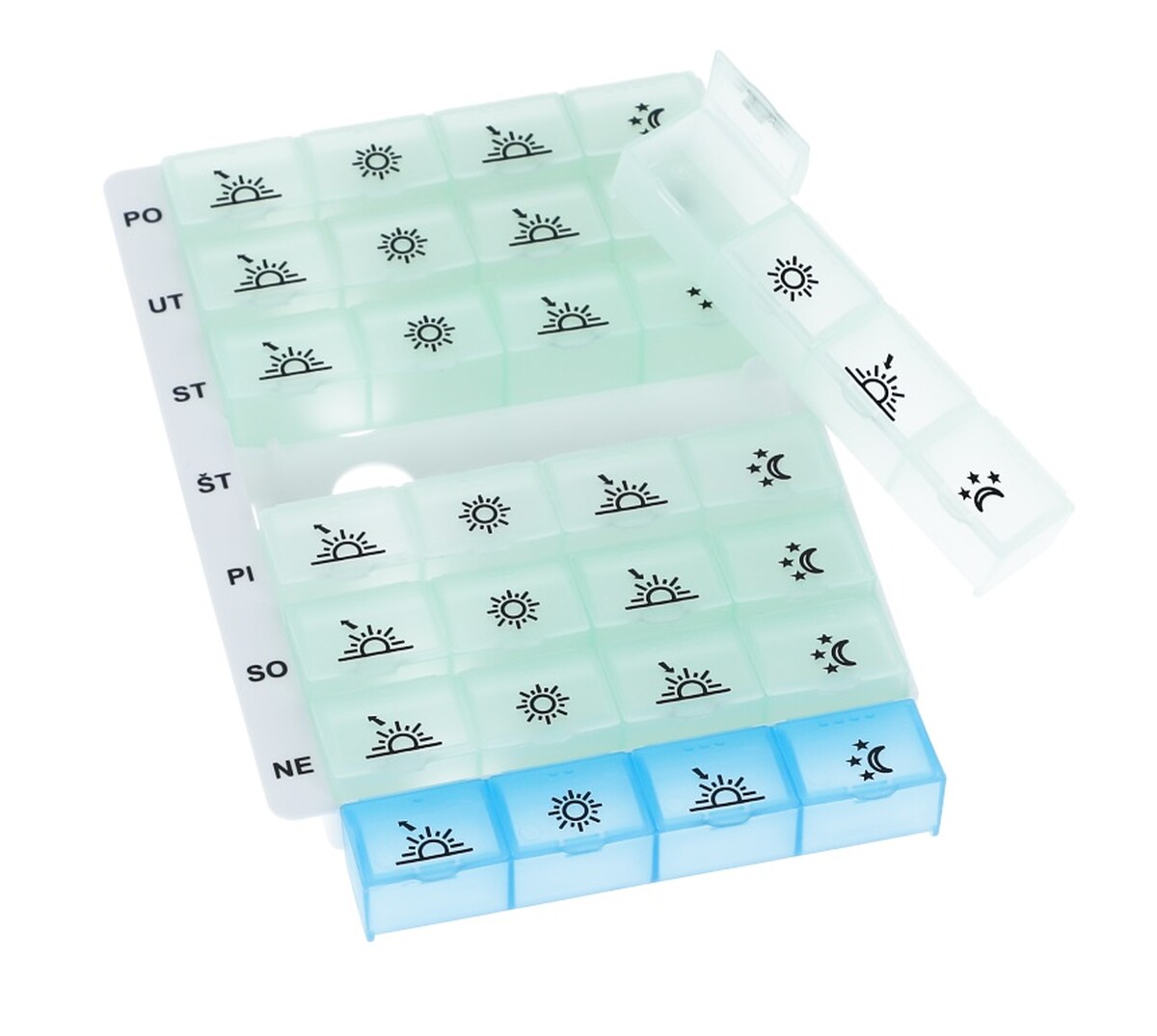Každý den je rozdělen na 4 části - RÁNO / OBĚD / VEČER / NOC. Můžete ho z kazety vyjmout a používat samostatně jako denní dávkovač. Každá část dne se otevírá samostatně pomocí víčka.