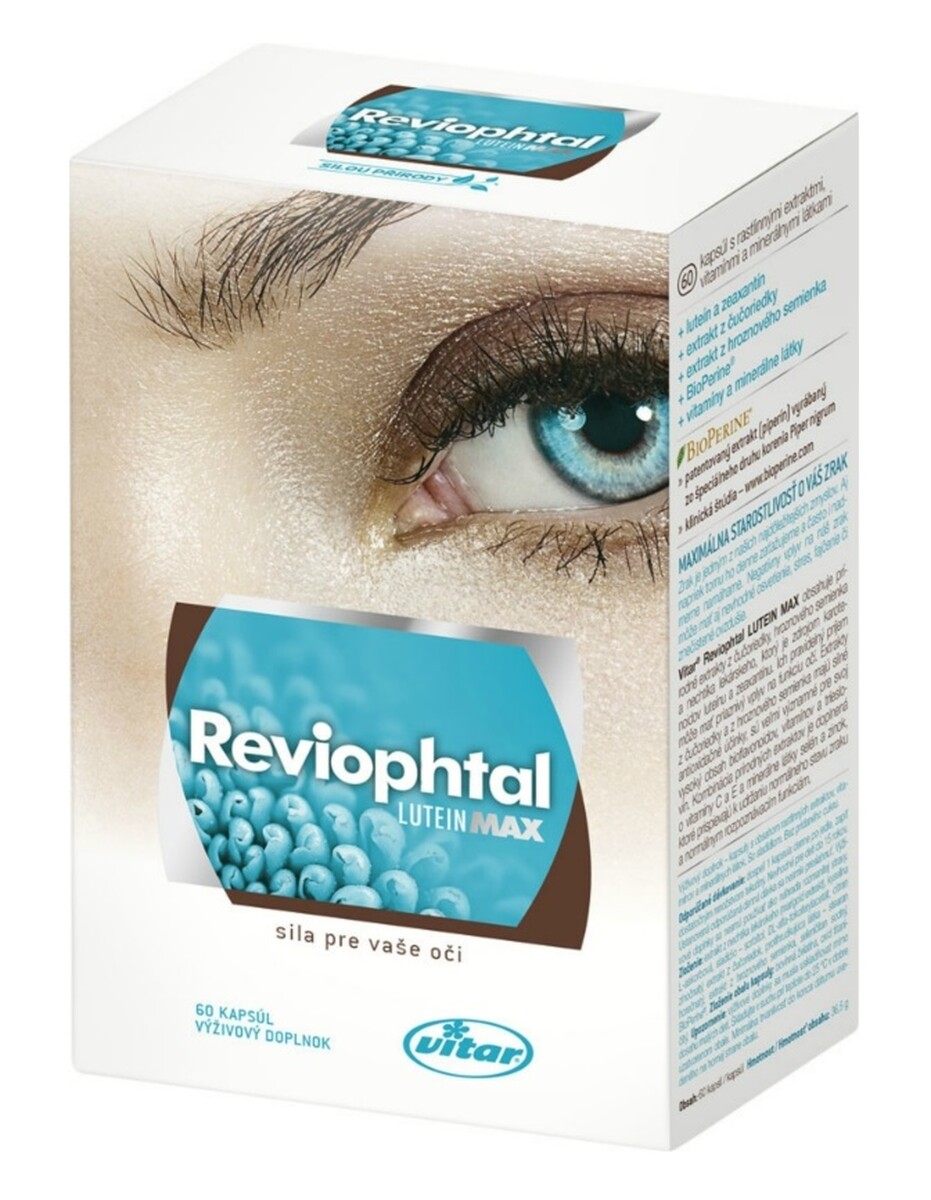 Výživový doplněk Reviophtal obsahuje přírodní extrakty z borůvky, hroznového semínka a měsíčku lékařského, které jsou zdrojem karotenoidů luteinu a zeaxantinu. Jejich pravidelný příjem může mít příznivý vliv na funkci očí.