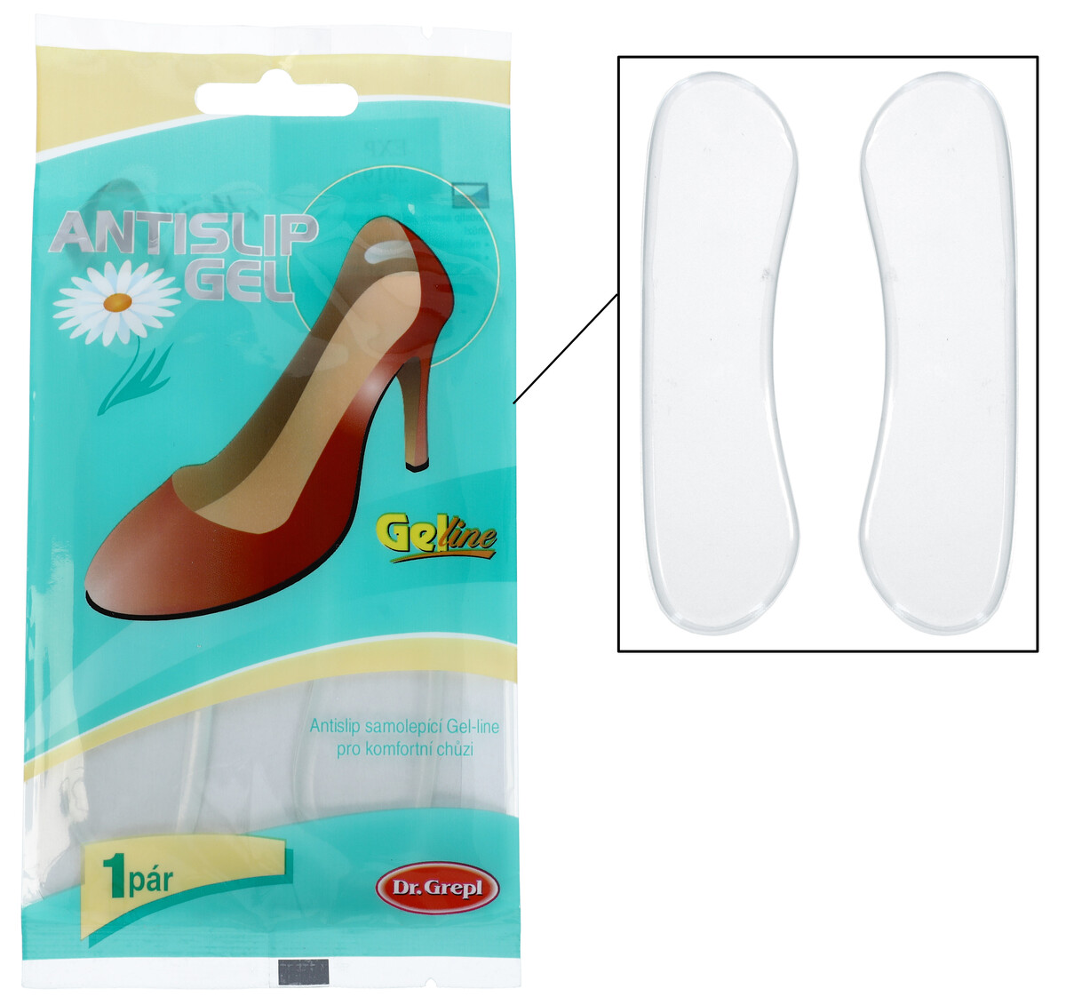 Opora paty vyrobena z měkkého transparentního gelu, určená do obuvi s vyšším podpatkem. Vlepuje se do vnitřního prostoru podpatku obuvi. Zdravotní pomůcka je velmi tenká, přispívá k pohodlné chůzi.