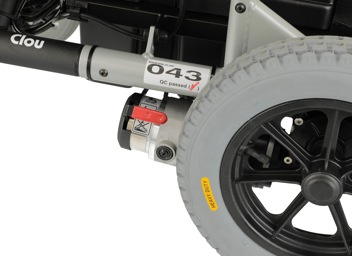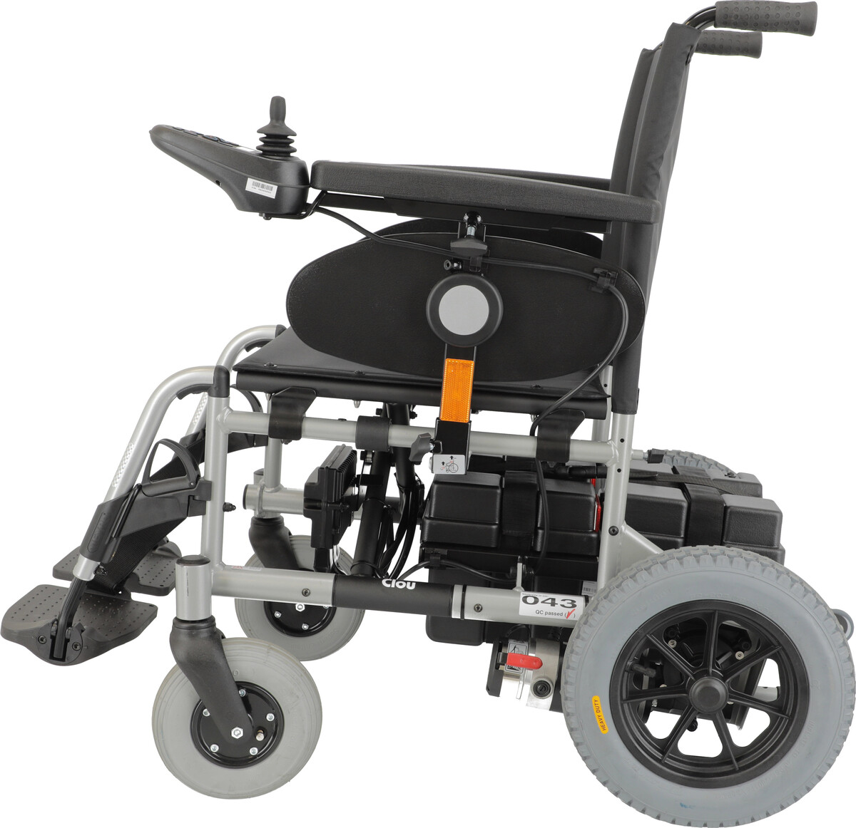 Skládací elektrický invalidní vozík Clou pro dospělé s malými rozměry a polomer otáčení (1m). Má odnímatelné bočnice, odnímatelné a výškově nastavitelné stupačky a ochranné kolečka, chránící vozík před převrácením. Ovládací skříňka je výškově a délkově nastavitelná podle potřeby pacienta. Vozík se pohybuje v prostoru pomocí jednoduchého vychylování řídící páky. Šířka sedu lze nastavit v rozmezí od 38 - 55 cm.