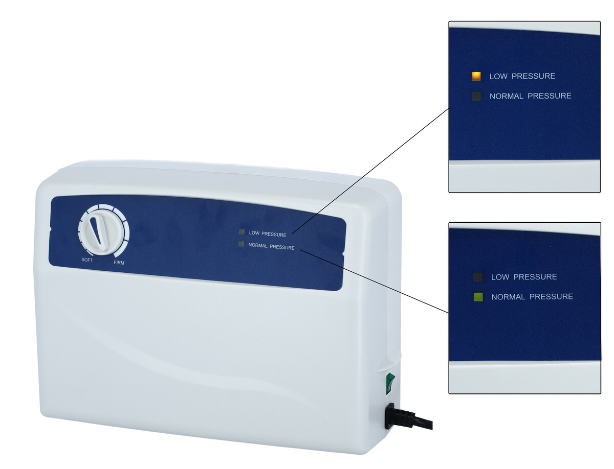 Kompresor obsahuje regulátor, který upravuje tlak v matraci na základě hmotnosti pacienta. K dispozici má světelné kontrolky, které signalizují optimální i nízký tlak v matraci.