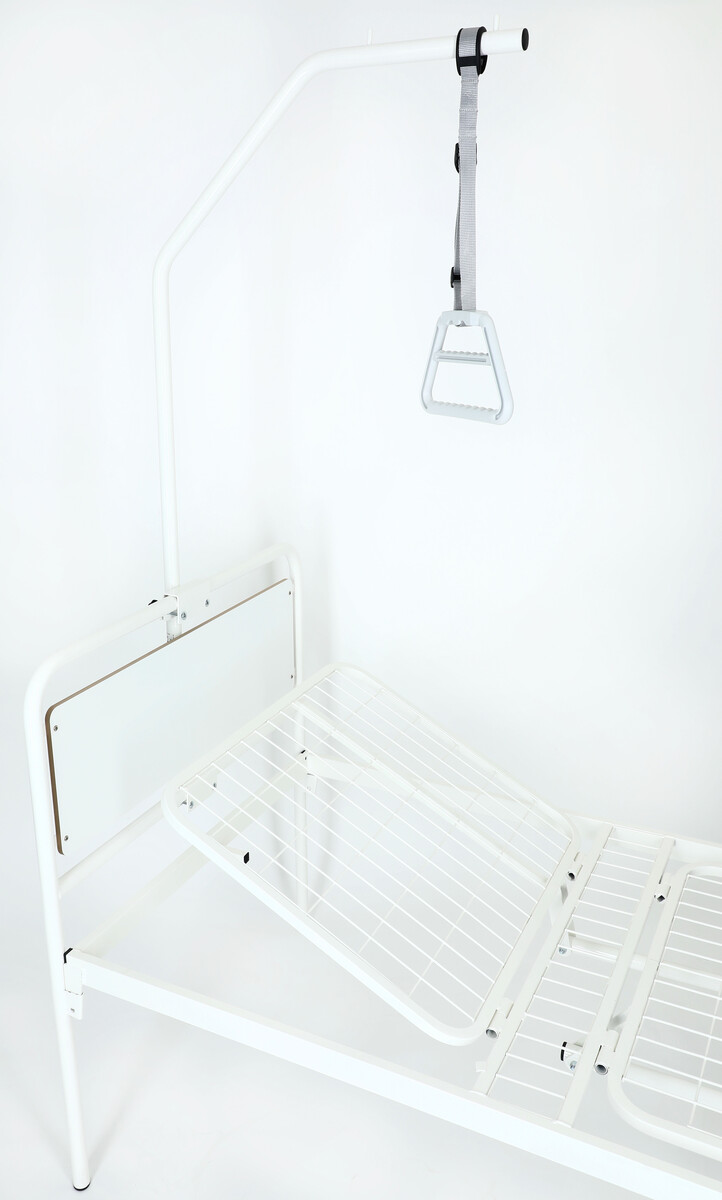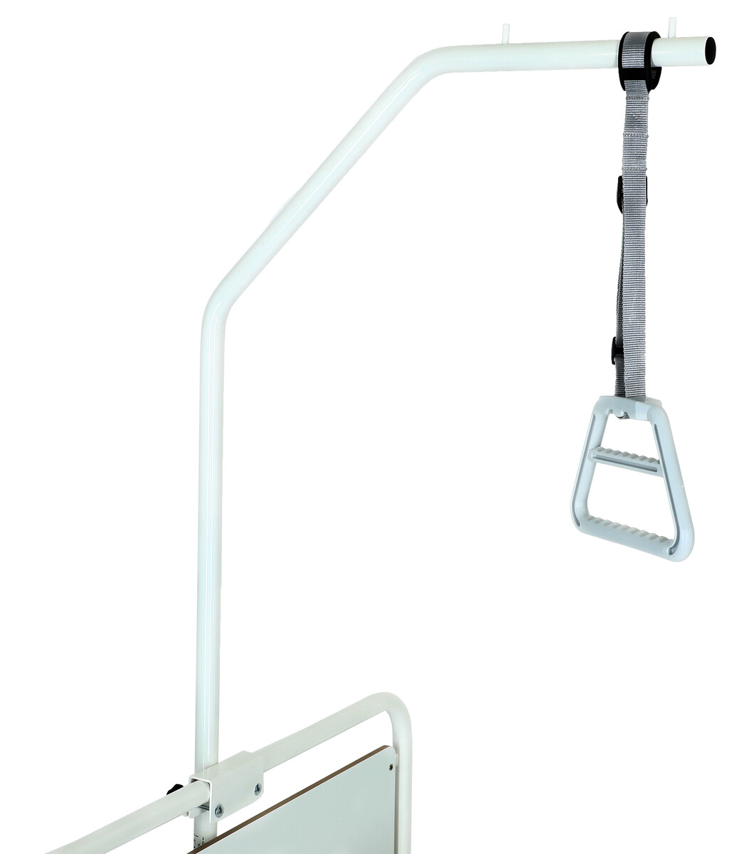 Hrazda, která se připevňuje vzadu o postel, je vyrobena ze zesílené chromované oceli. Je vhodná zejména pro nemocniční postele. Výška hrazdy od vrchní části čela postele až po místo, kde se připevňuje popruh je 135 cm.