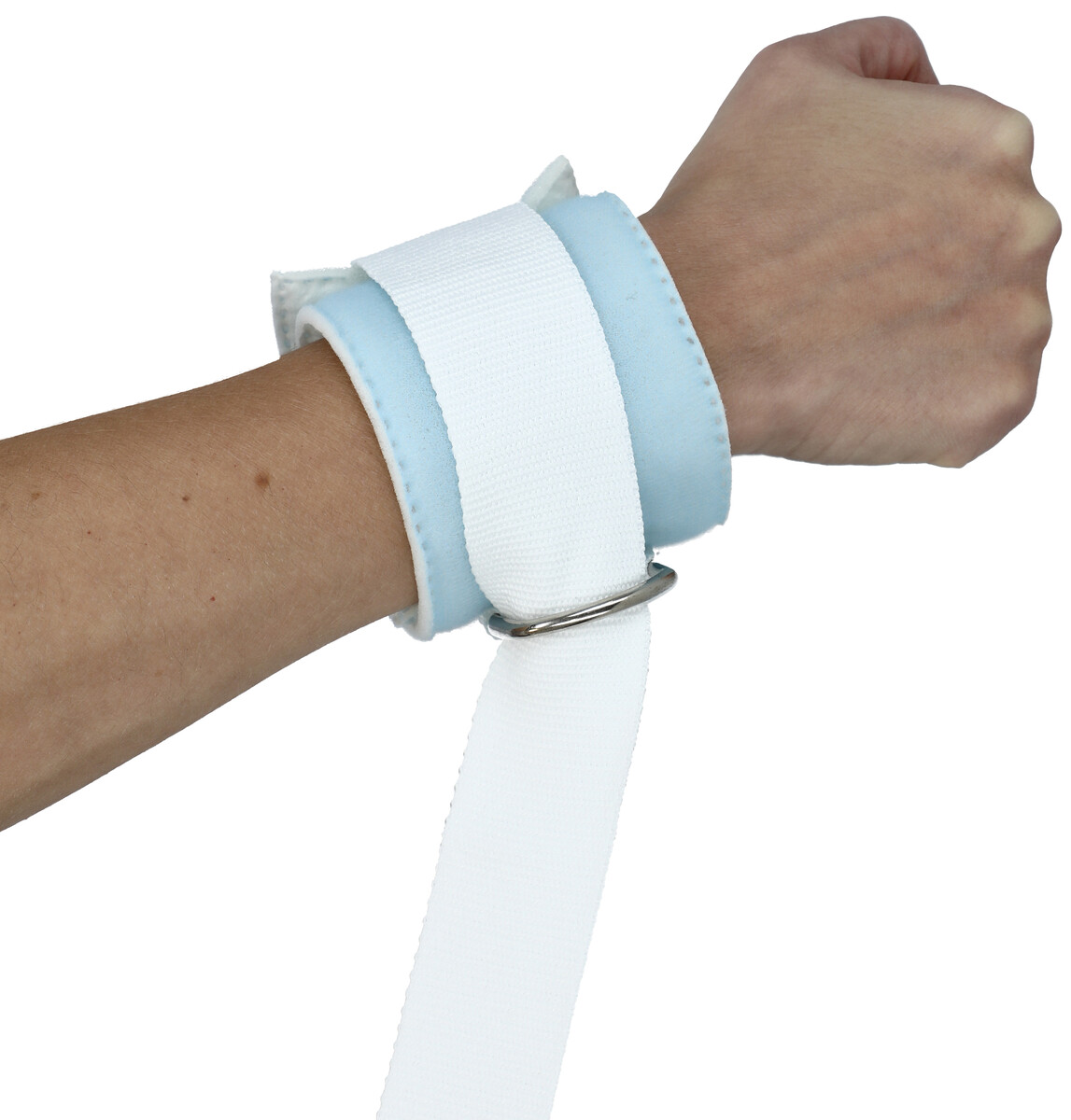 Fixace pro ruce a nohy se smyčkou vyrobena z pevné tkaniny příjemné na dotek těla. Dlouhý bílý pás se upevňuje na postel nebo pod postel, aby pacient nehýbal rukou, například během infuze.