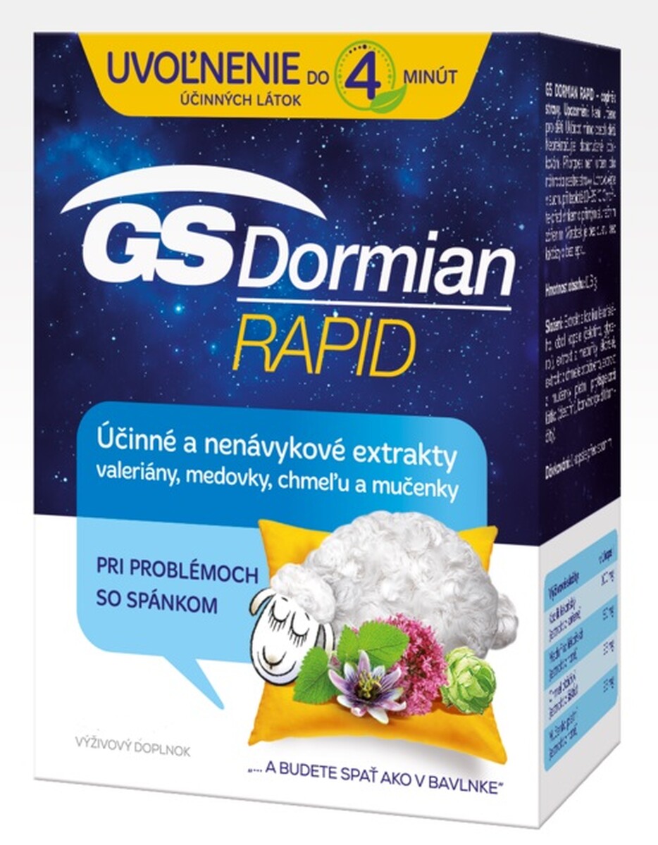 Unikátní výživový doplněk, který je vhodné užívat při potížích se spánkem. Účinné látky v něm obsažené působí na rychlé a příjemné usínání, navození relaxace, klidný a posilující spánek po celou noc, zklidnění organismu a uvolnění účinných látek do 4 minut. Po ukončení užívání nevyvolává vznik závislosti a ani abstinenční příznaky.