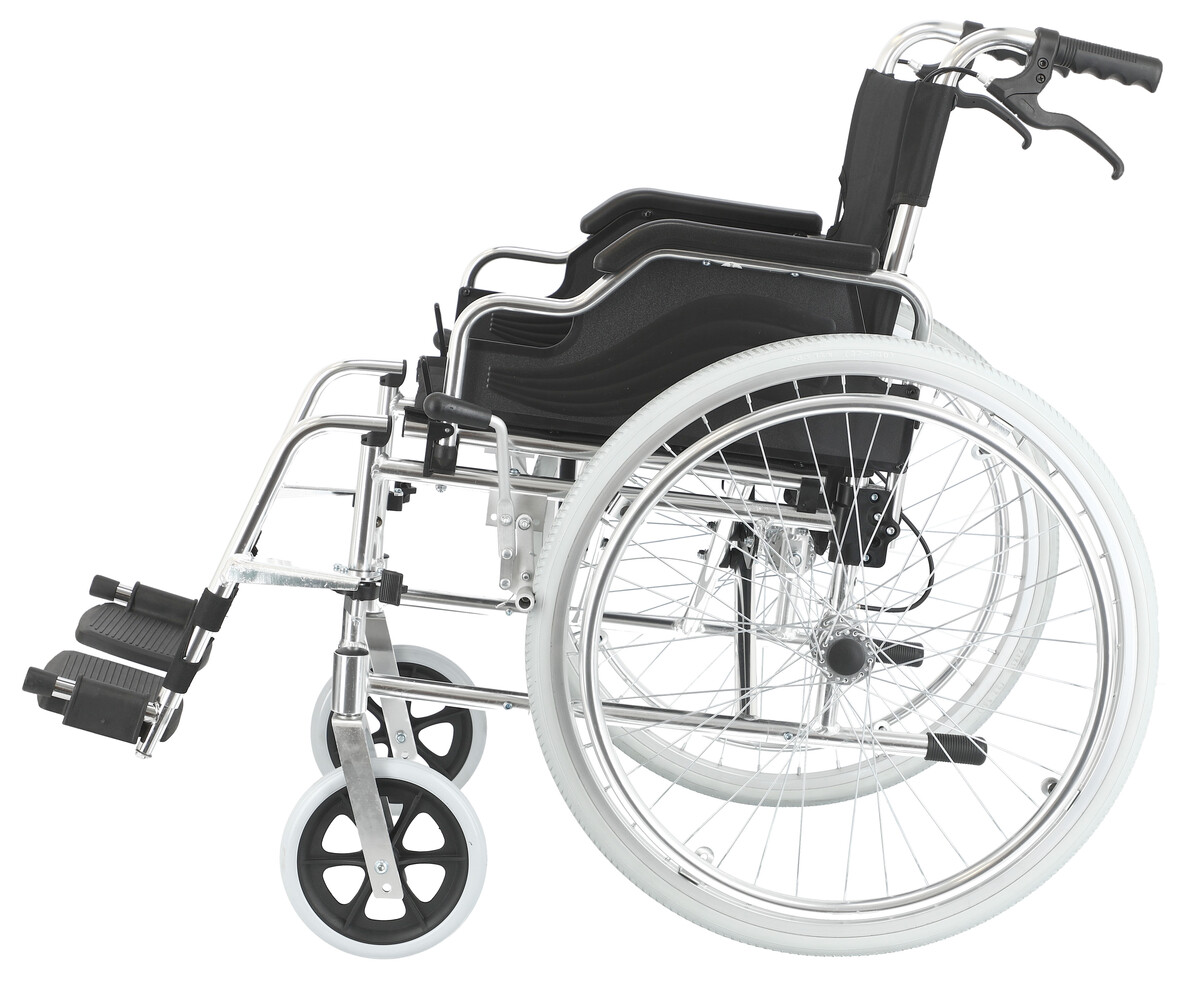 Opěrky nohou jsou otočné a odnímatelné . Přední 6 "PVC kolečka a 24" zadní polyuretanová kola, poskytují hladkou a bezpečnou jízdu.Invalidní vozík UNIZDRAV - hliníkový, odlehčený