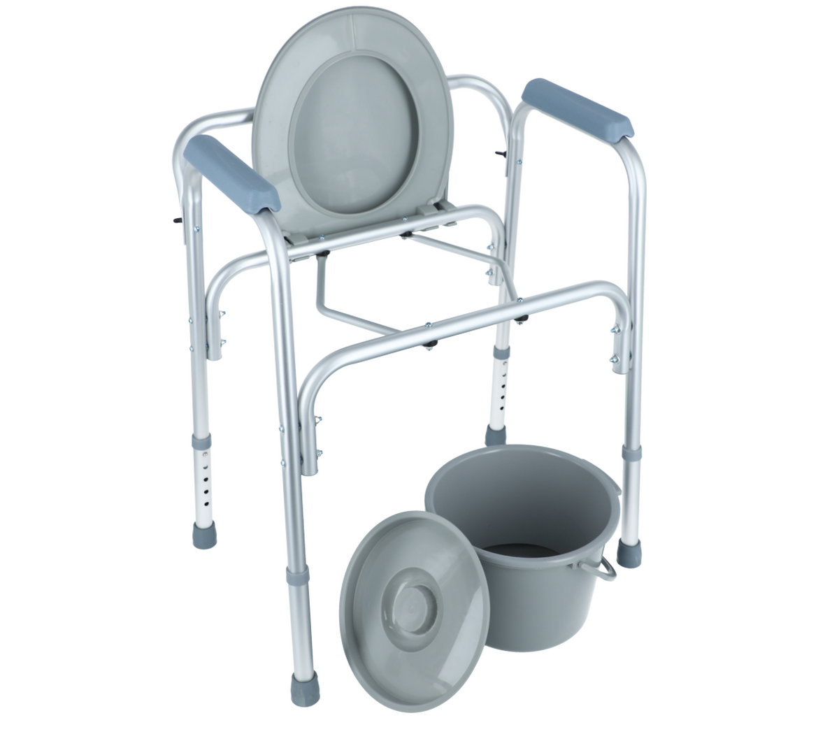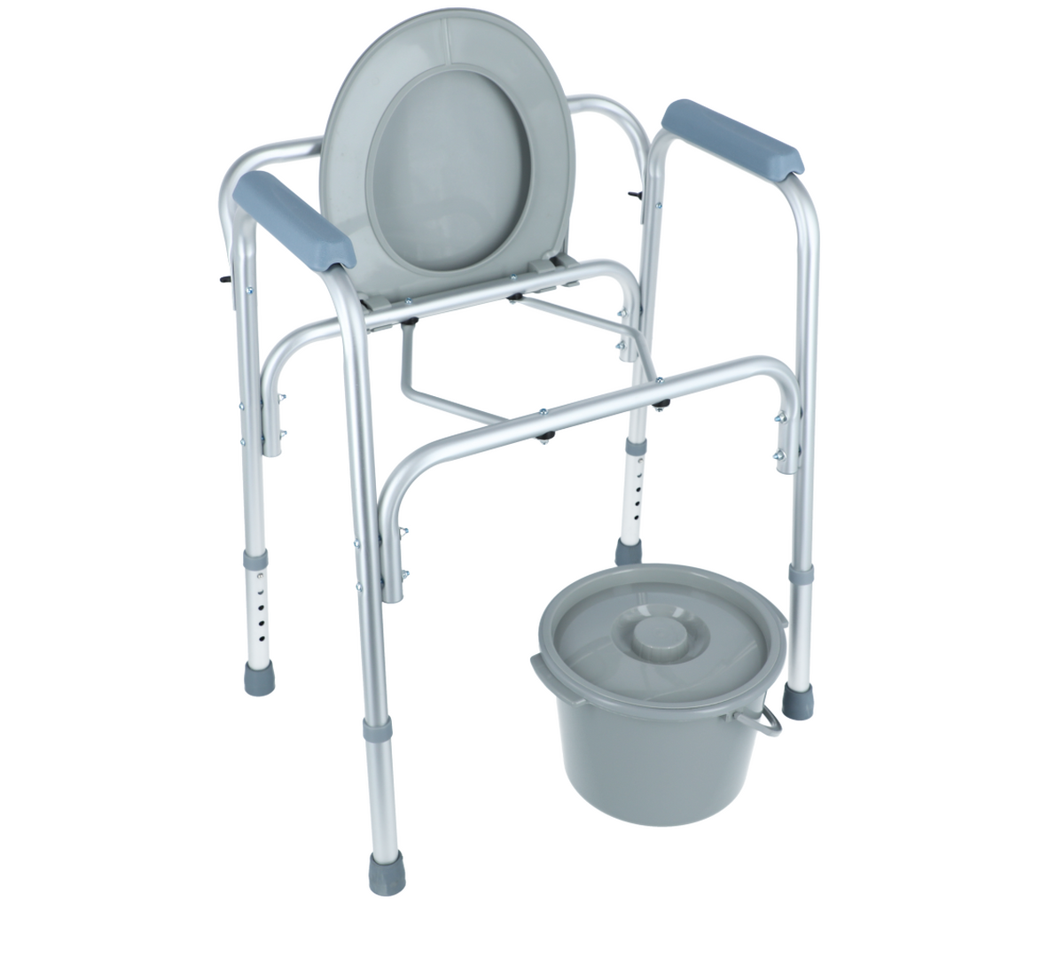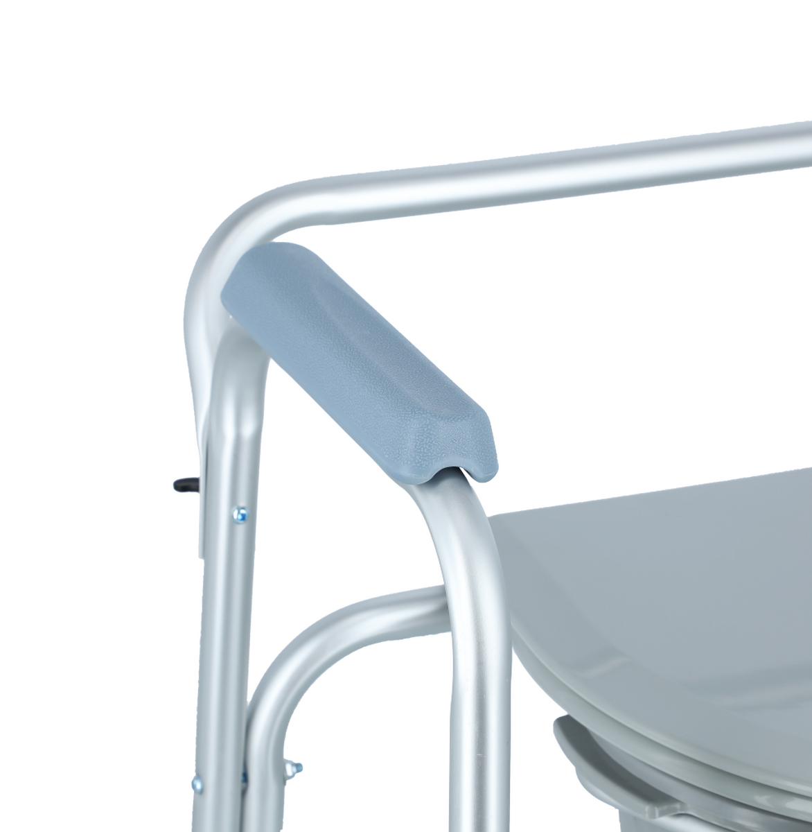 Židle je z lehkého hliníkového rámu s eloxovaným povrchem. Plastová nádoba je snadno vyjímatelná. Pevné umělohmotné područky nabízejí bezpečné uchopení při sezení a vstávání.