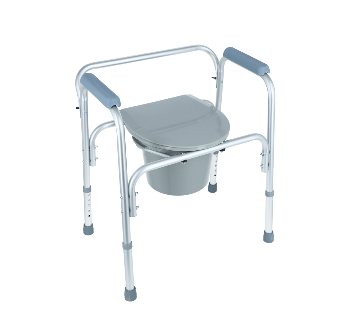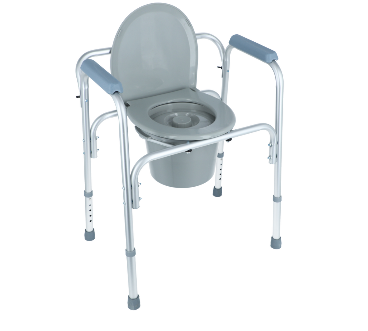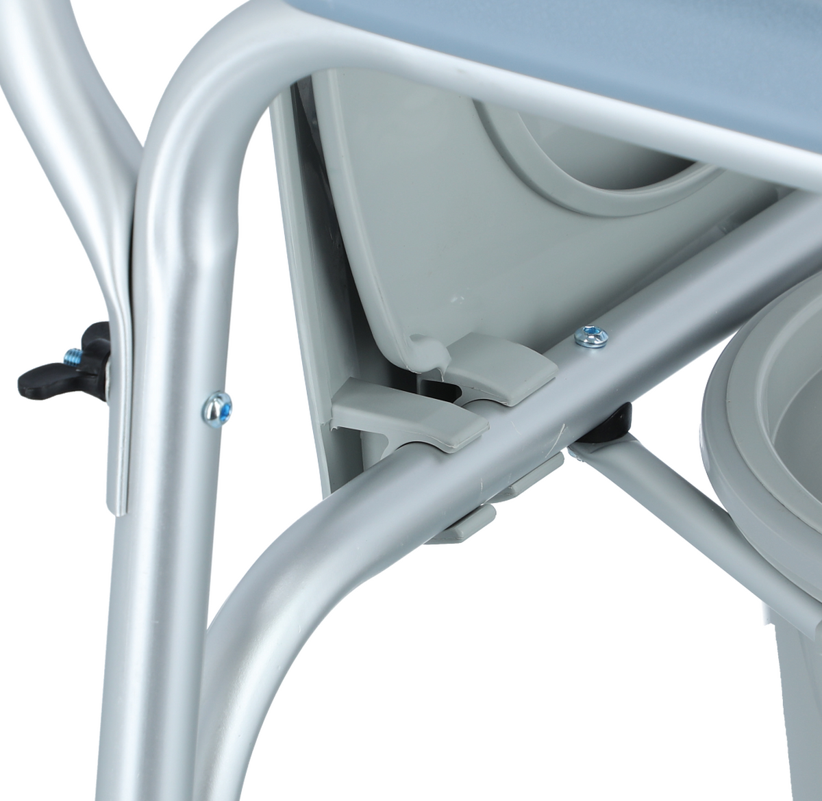 Židle je z lehkého hliníkového rámu s eloxovaným povrchem. Plastová nádoba je snadno vyjímatelná. Pevné umělohmotné područky nabízejí bezpečné uchopení při sezení a vstávání.