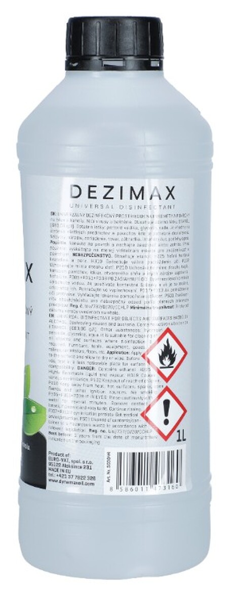 Dezinfekční prostředek DEZIMAX byl zařazený do registru biocidních výrobků zpřístupněných na trhu v Slovenské republice podle § 20 ods. 2 biocidného zákona pod registračním číslem bio/737/D/20/CCHLP (účinná látka ETANOL CAS 64-17-5).