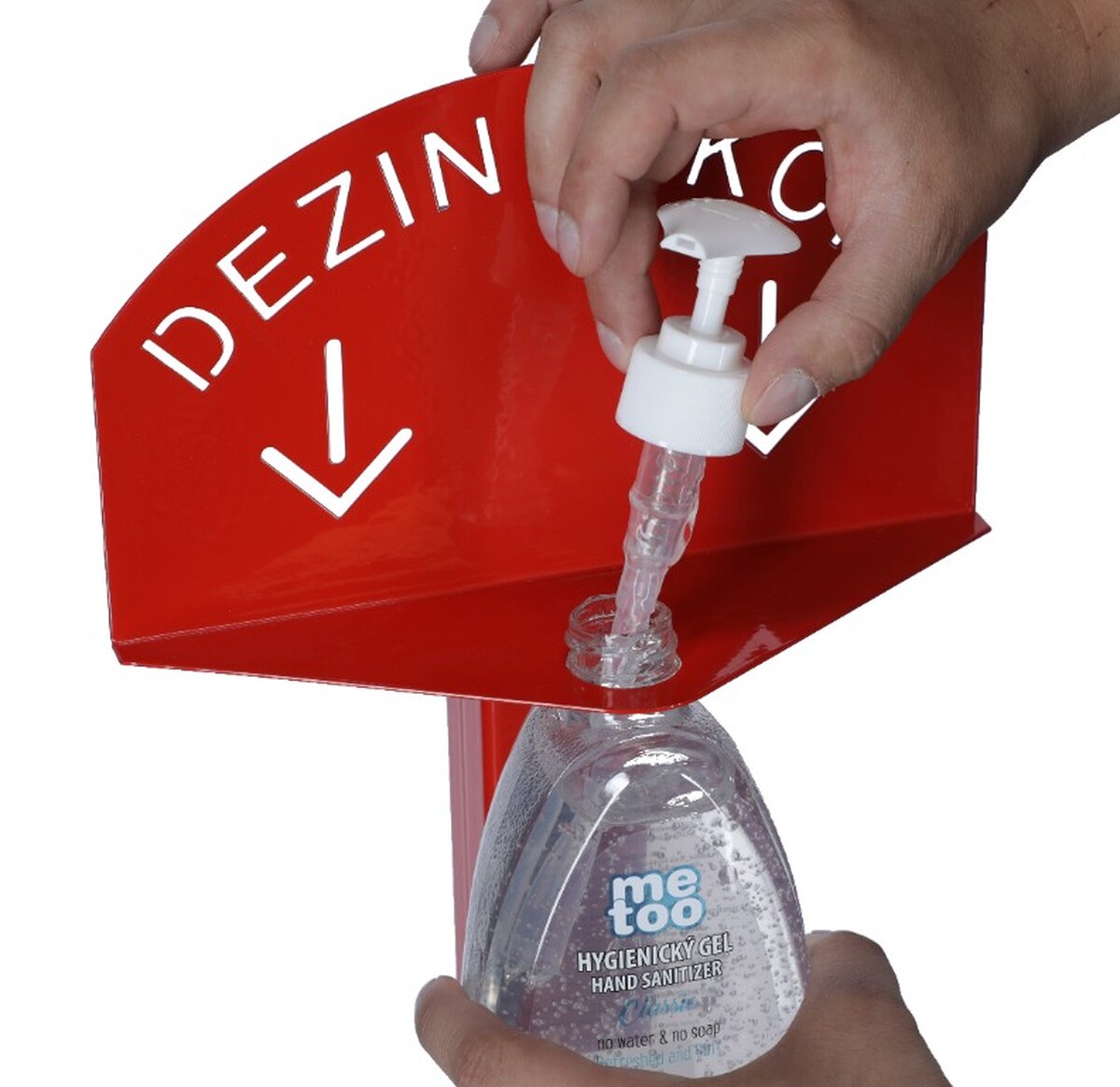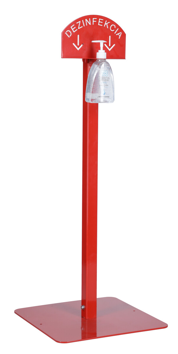 Univerzální kovový stojan na upevnění dezinfekčních prostředků na ruce před vstupem do provozoven.