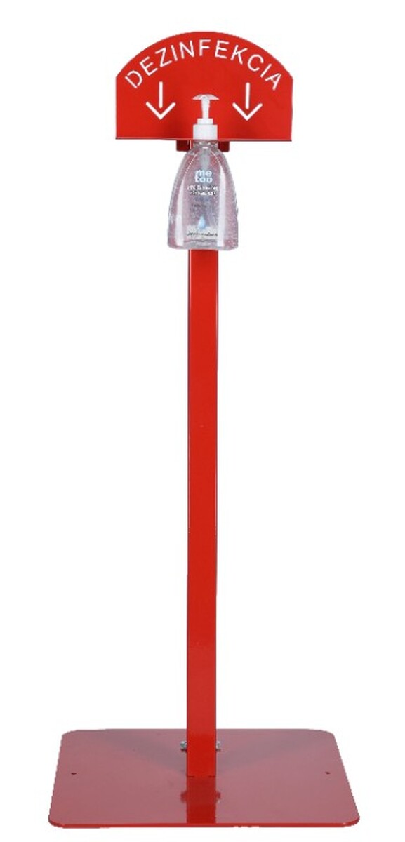 Stojan na dezinfekci rukou má červenou barvu a informační nápis.