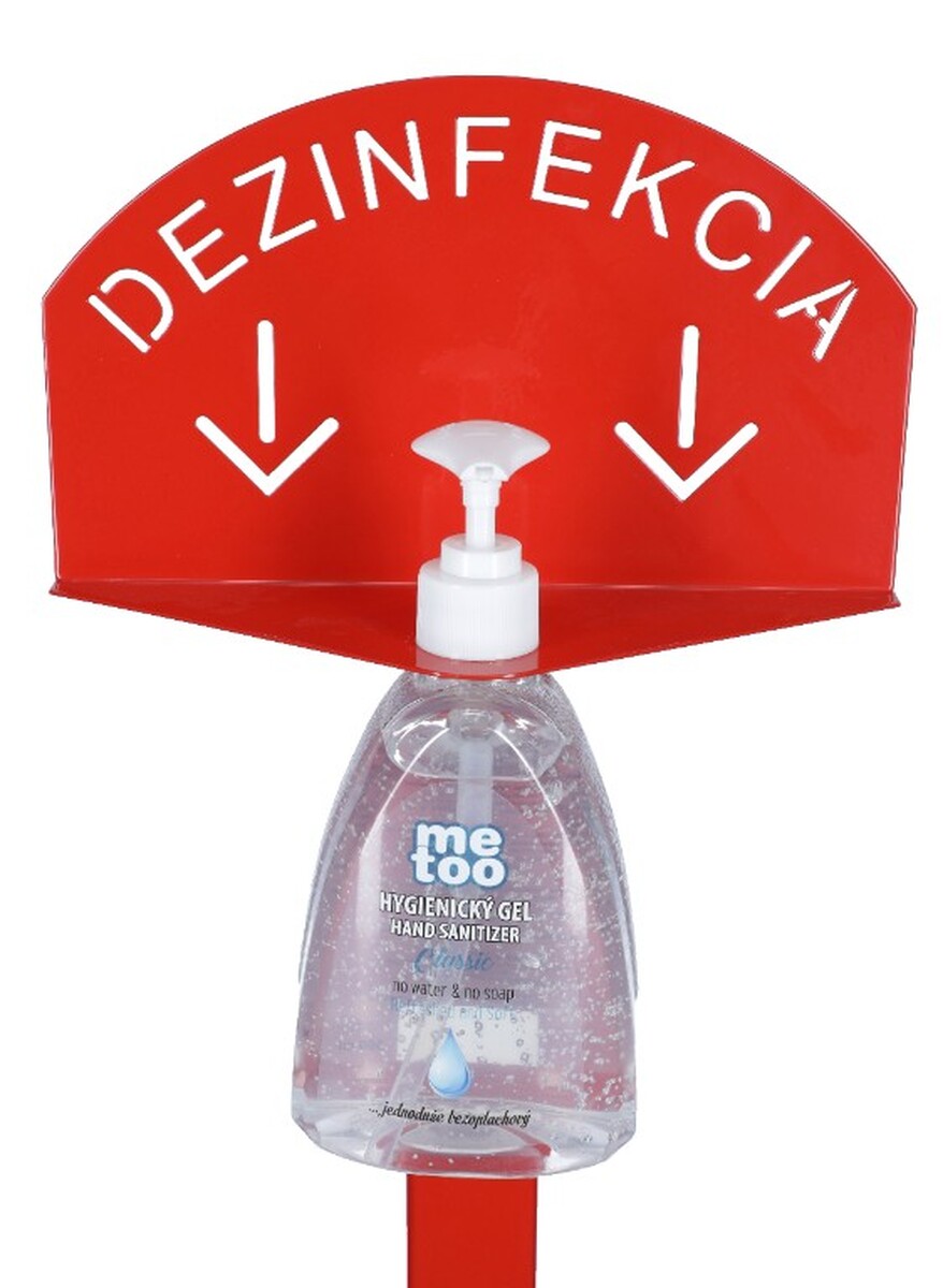 Stojan červený na dezinfekci rukou s dezinfekčním gelem Me Too, 500 mlStojan červený na dezinfekci rukou s dezinfekčním gelem Me Too, 500 ml