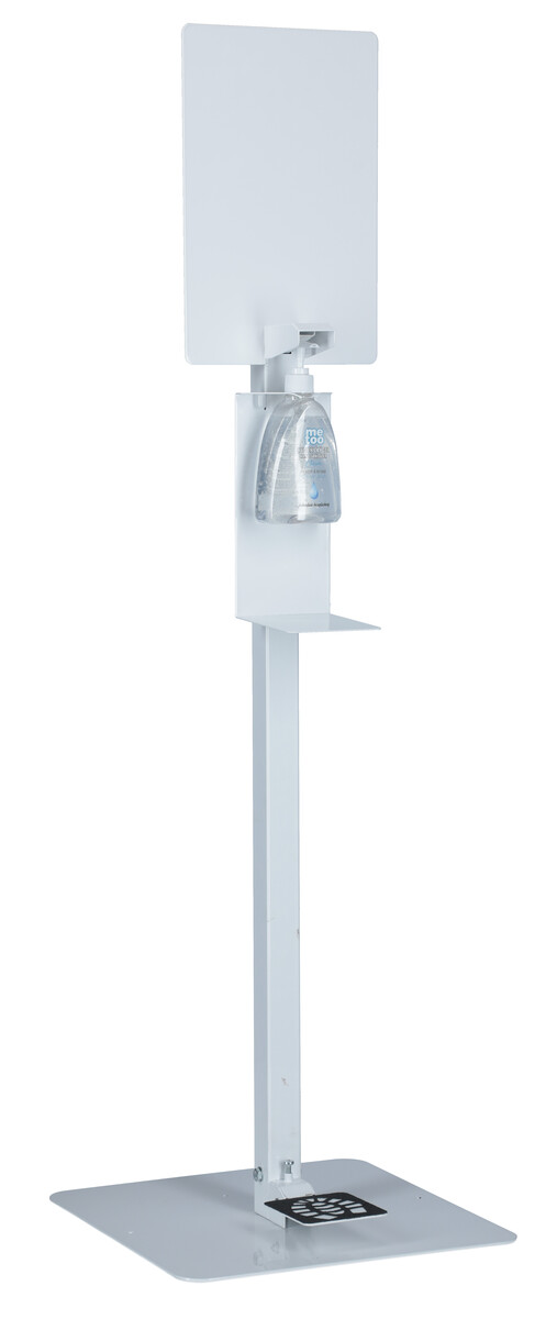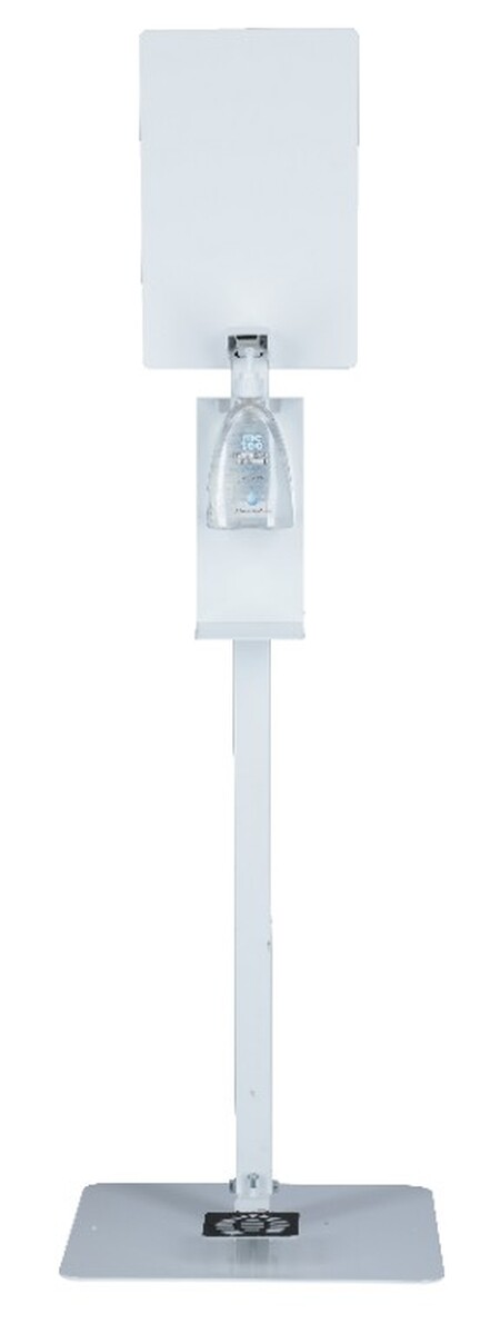 Stojan na dezinfekci rukou má bílou barvu a plochu na umístění libovolného informačního nápisu.