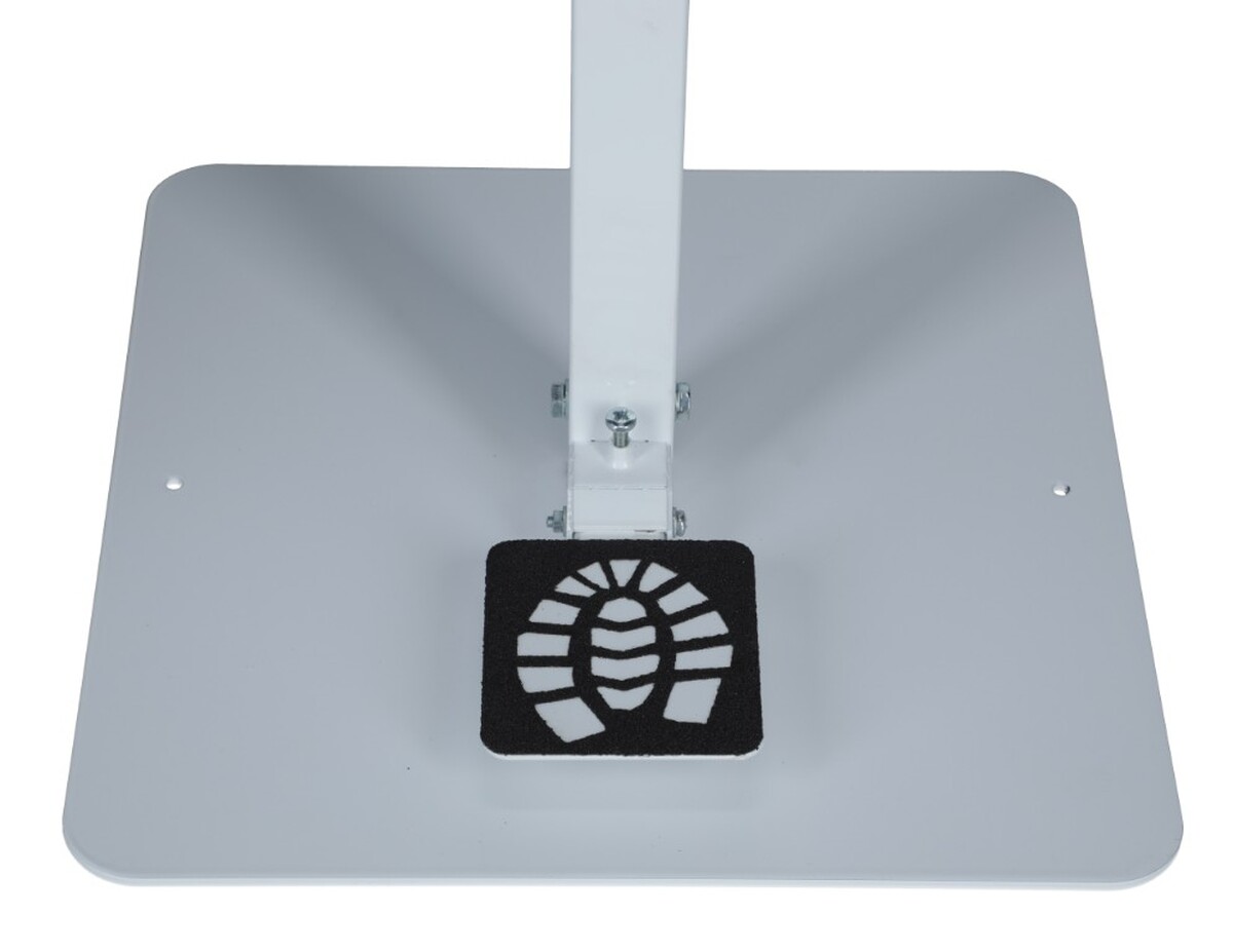 Odolná stabilní konstrukce dezinfekčního stojanu umožňuje jeho volné umístění v prostoru. Předvrtané díry na podstavci poskytují také možnost fixního připevnění k zemi. Kromě základního umístění dezinfekce pomáhá také předcházet převrhnutí nebo krádeži.
