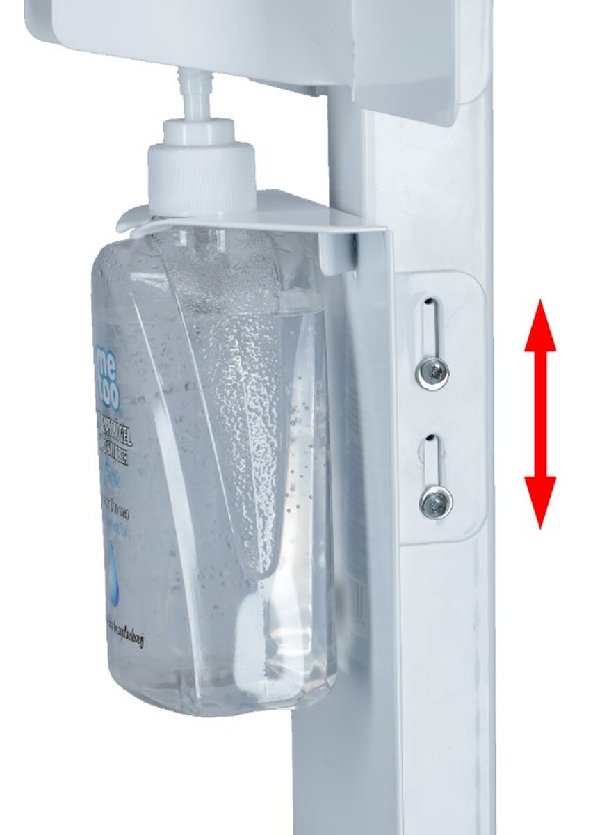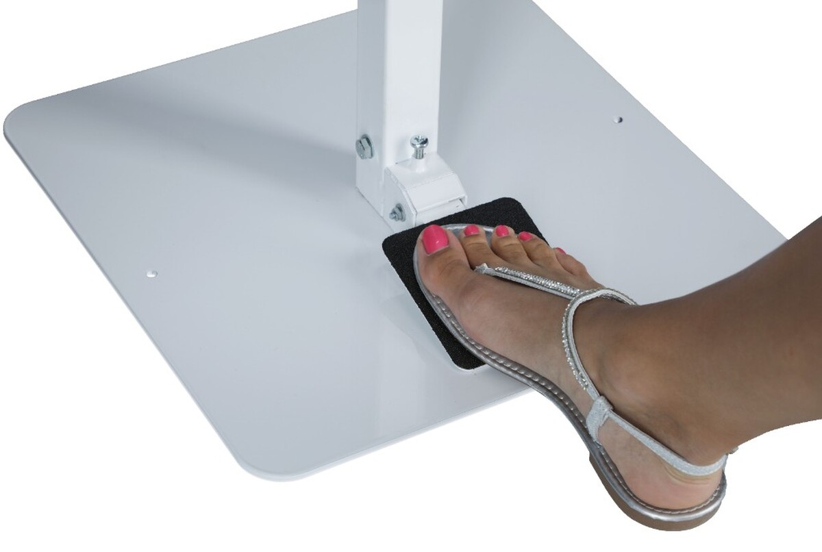 Dávka dezinfekce se uvolní po sešlápnutí pedálu na spodu stojanu a tím pádem ruce nepřichází do kontaktu se stojanem. Otvor s průměrem cca 3 cm poskytuje možnost upevnění různorodé nádoby s dezinfekcí. Výšku podstavce na dezinfekci je možné měnit podle vámi požadované polohy pomocí 2 šroubů z božní strany stojanu, co zaručuje použití nádoby na dezinfekci v různých velikostech.