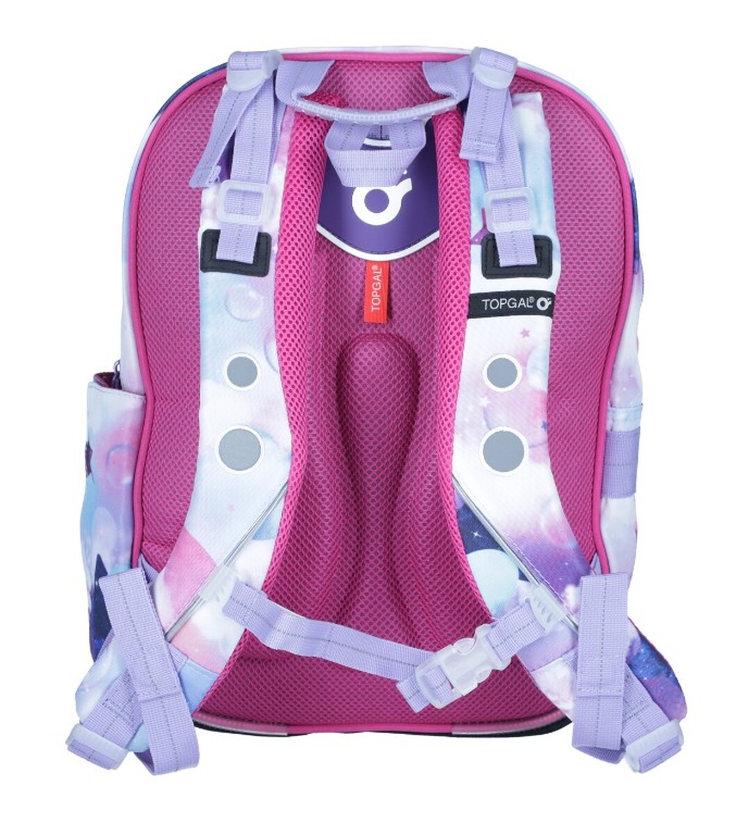 O správné držení školní tašky na zádech se postará zpevněná záda z měkké lisované pěny, vyztužené nastavitelné ramenní popruhy a hrudní pás. Popruhy jsou anatomicky tvarované a postavě se přizpůsobují upínáním v horní a spodní části, díky čemuž budou správně sedět i na drobných zádech dítěte. Konečky popruhů jsou vybaveny magnetkami, takže nebudou při nošení překážet. Výškově nastavitelný hrudní pásek zase zajistí, že popruhy nesklouznou ani z úzkých ramen.