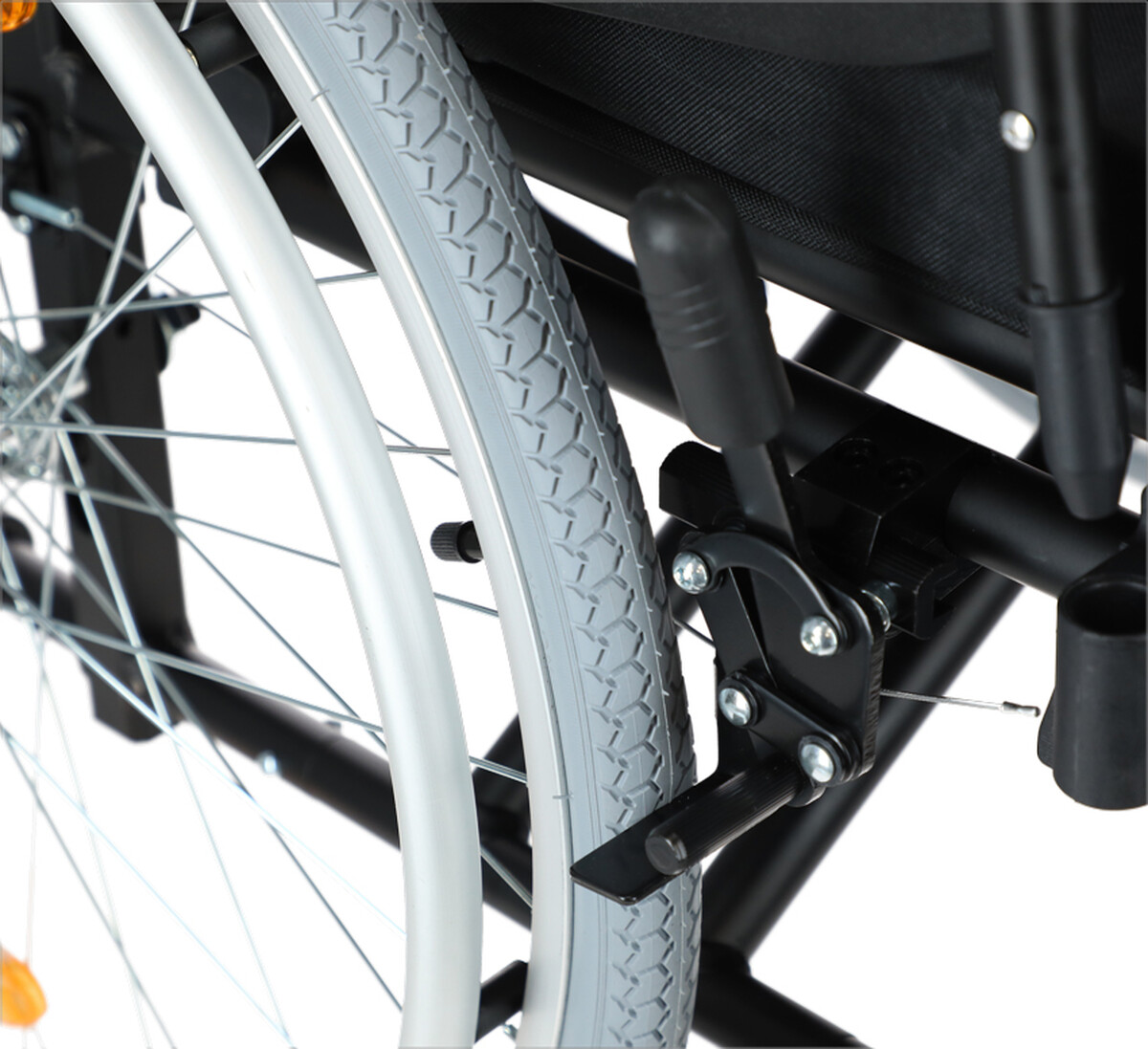 Bočnice vozíku jsou vyklopitelné a zároveň odnímatelné, což pacient ocení při nasednutí a vysednutí z vozíku.