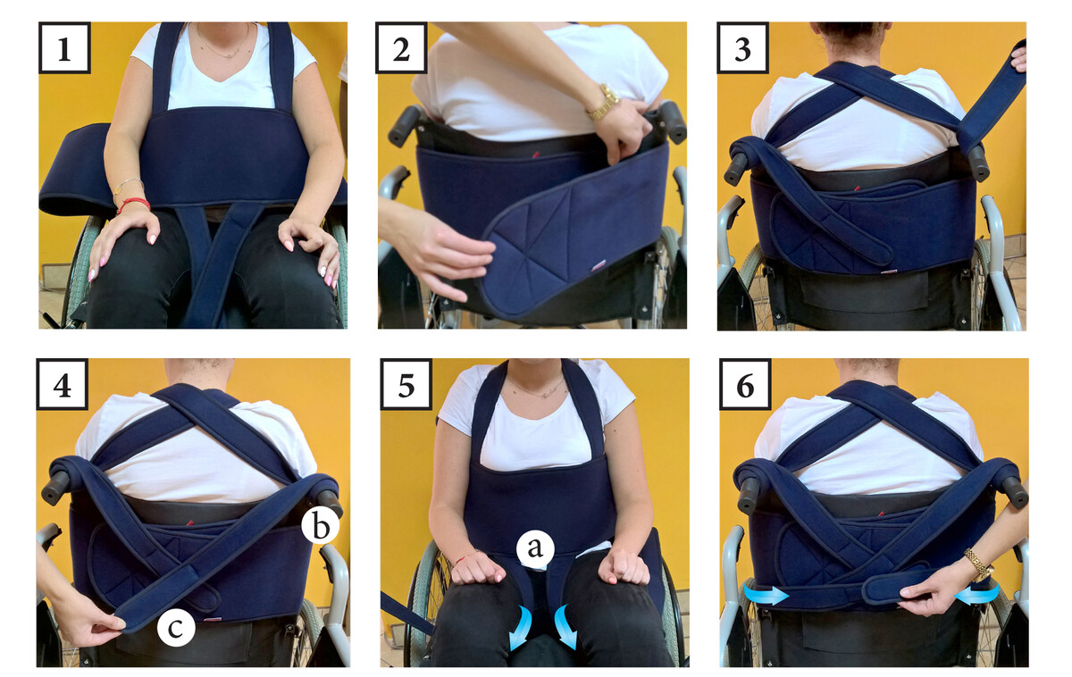 Typ 1 se upíná kolem břicha pacienta a opěrky vozíku zezadu (neobsahuje popruh upínající se přes rozkrok).