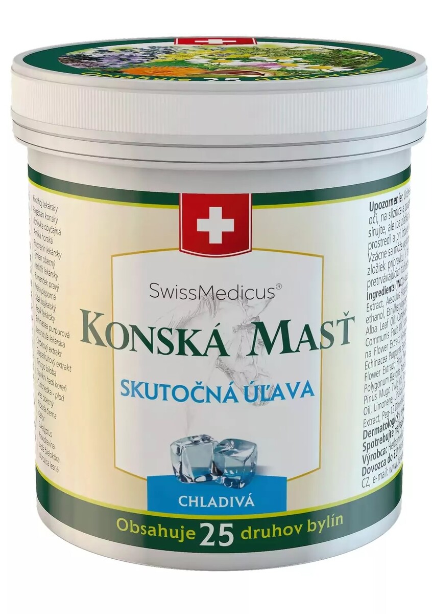 Chladivá koňská mast SwissMedicus je bylinný balzám vyrobený podle tradiční receptury s vysokým obsahem extraktů plodů kaštanu koňského, kosti hojí, rozmarýnu a arniky, obohacený o množství rostlinných bio aktivních látek.