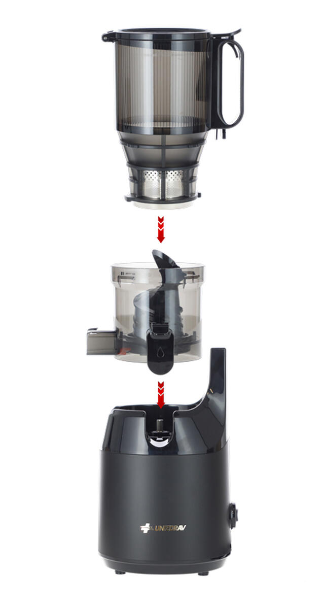 Šnekový odšťavňovač UNIZDRAV byl nadesignovaný s XXL plnícím otvorem s průměrem až 13 cm. Do dostatečně velkého otvoru je možné vkládat najednou i větší kusy ovoce a zeleniny, co ušetří čas přípravy i lisování. Nádoba na šťávu pojme cca 1000 ml tekutiny, nádoba na odpad 800 ml.