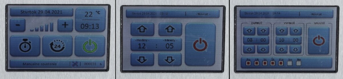 Přehledný displej umožňuje uživateli nastavit si vlastní čas provozu zařízení, autostart, intenzitu ventilátoru, jakož i datum a jas obrazovky. Infrazářič je navíc vybaven barevným podsvícením, které indikuje stav provozu – zelená barva při zapínání, modrá během provozu, červená při výskytu technického problému.