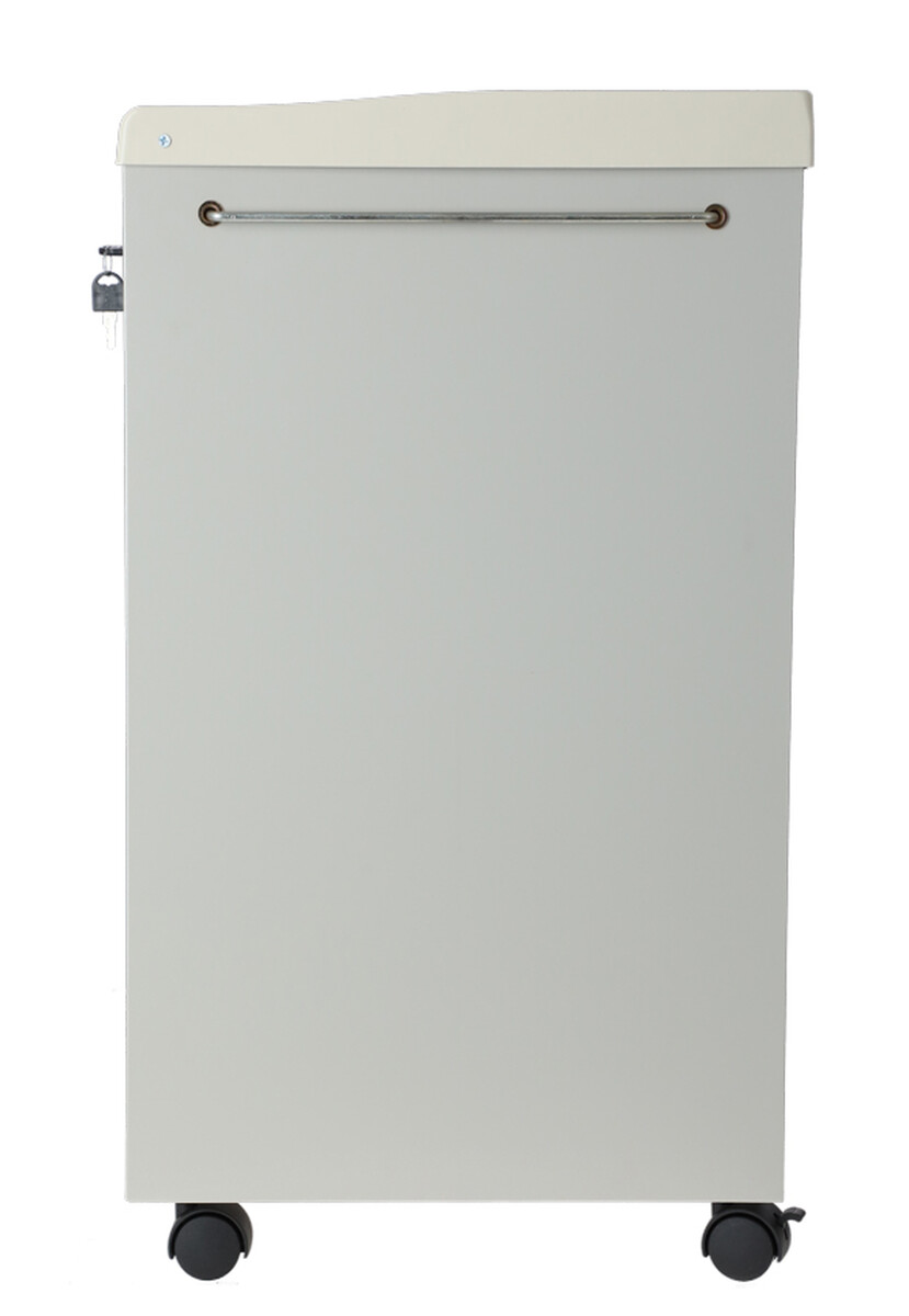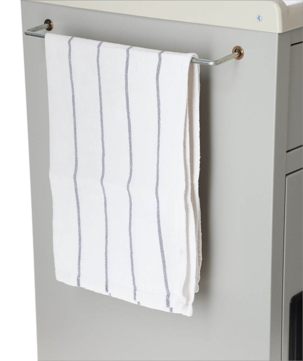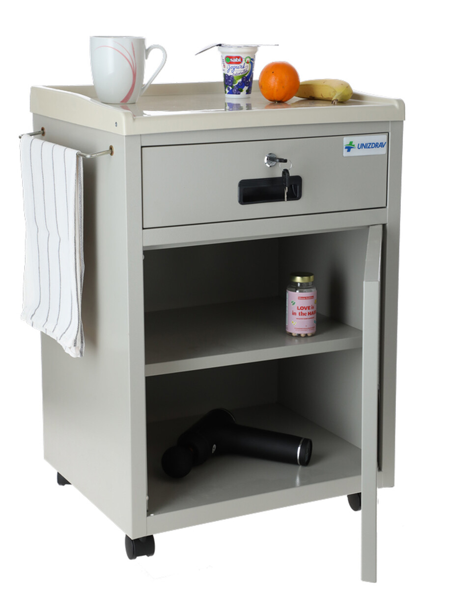 Součástí nočního stolku je jedna uzamykatelná zásuvka a jedna prostorná skříňka s poličkou, kam se vejde všechno potřebné od pracovního vybavení, léčiv až po osobní věci. Vrchní odkládací plocha je doplněna o vyvýšené okraje, které pomáhají zabránit pádu předmětů. Na obou stranách skříňky jsou navíc k dispozici praktické věšáky, které poslouží k zavěšení příručního ručníku nebo jiných lehčích předmětů.