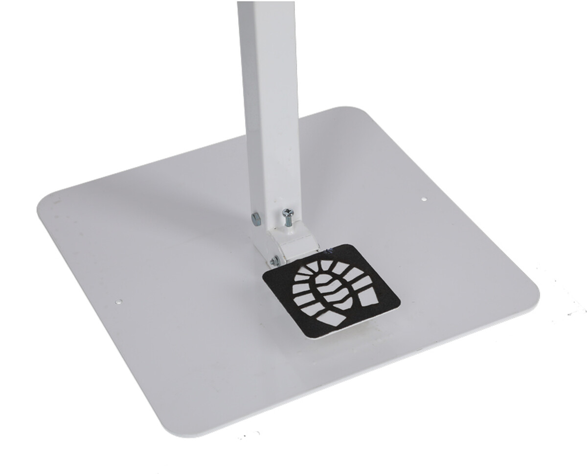 Odolná stabilní konstrukce dezinfekčního stojanu umožňuje jeho volné umístění v prostoru. Předvrtané díry na podstavci poskytují také možnost fixního připevnění k zemi. Kromě základního umístění dezinfekce tedy pomáhá také předcházet převrhnutí či krádeži.