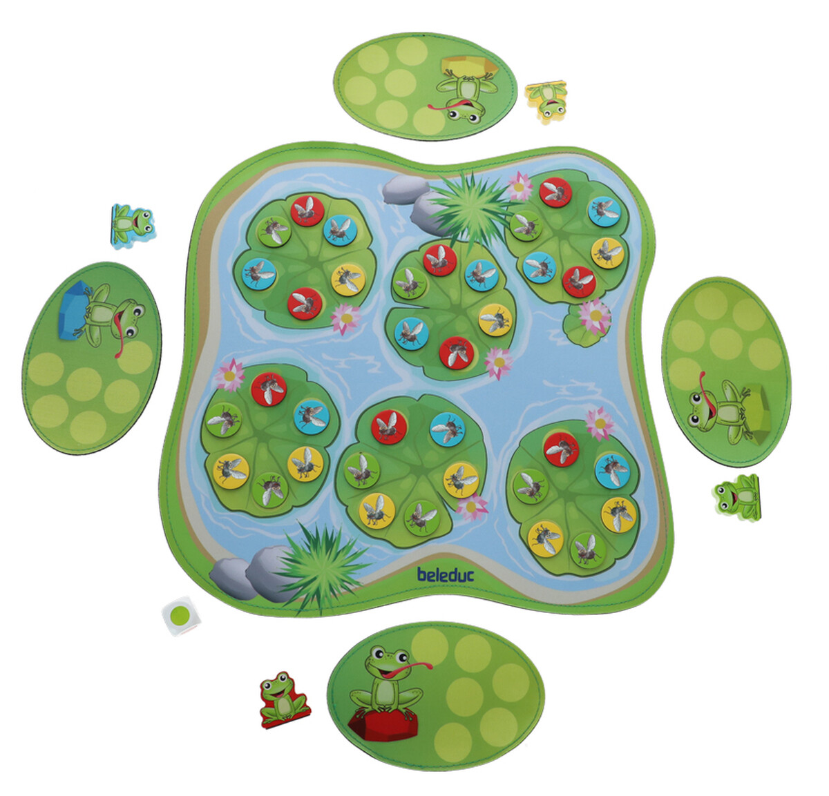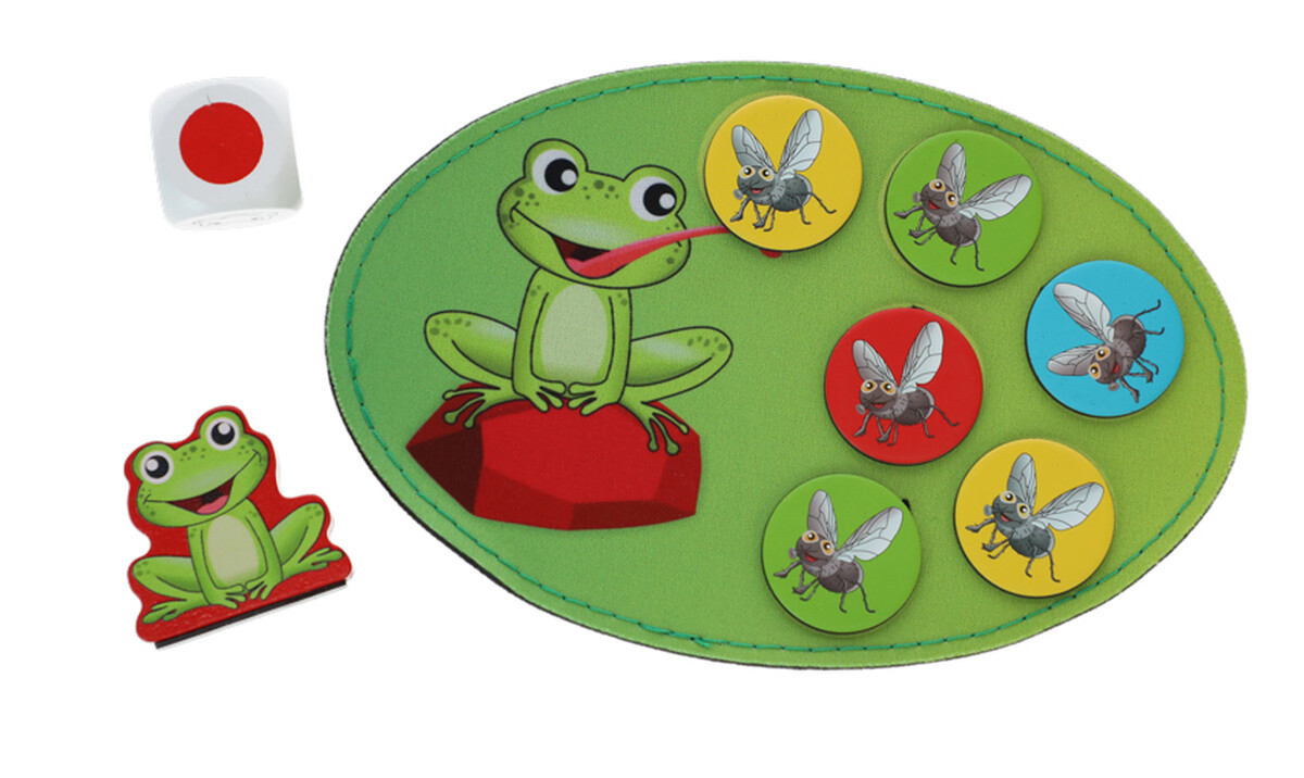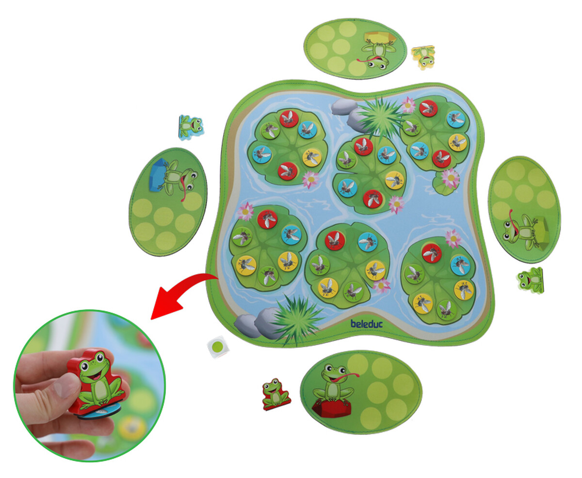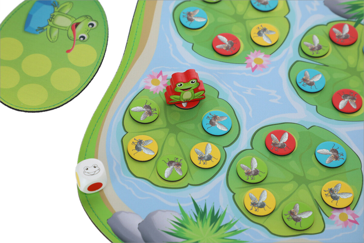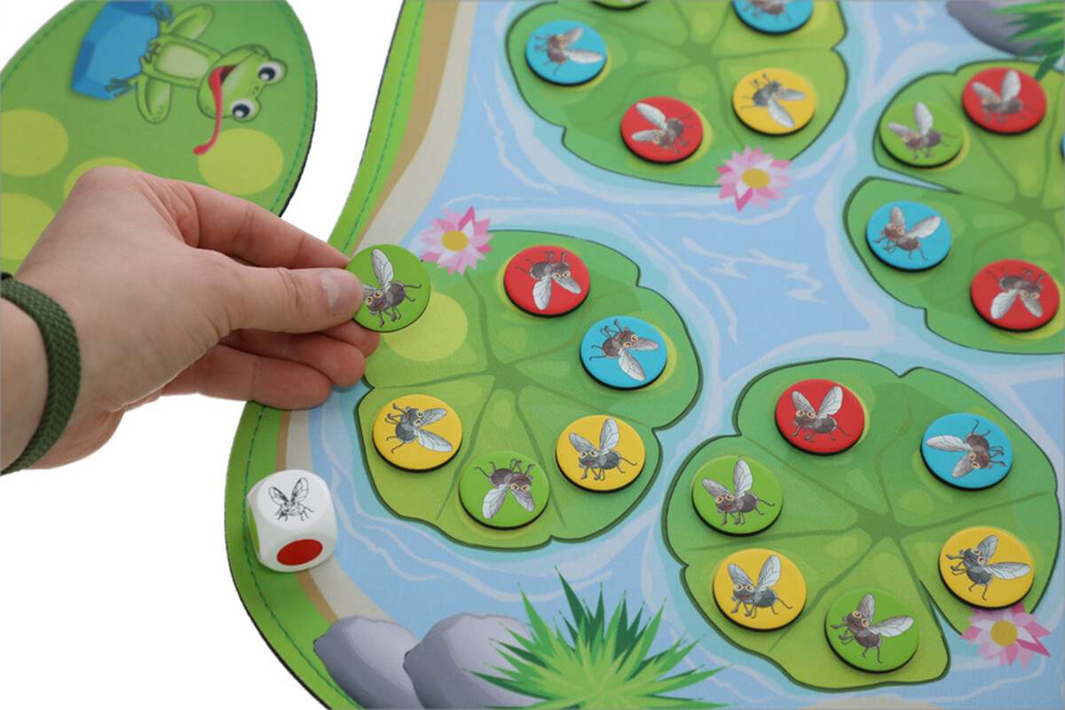 Hrací podložka představuje jezírko, které je plné barevných mušek. A právě ty třeba pochytat. Každý hráč se pomocí vlastní žabky pokouší nasbírat co nejvíc mušek. Ale pozor, ne vždy se to podaří. Žabky a vybrané mušky obsahují magnety, díky čemu se dají vybírat. Magnet v sobě ale nemá každá muška, proto je důležité si její pozici na podložce zapamatovat.