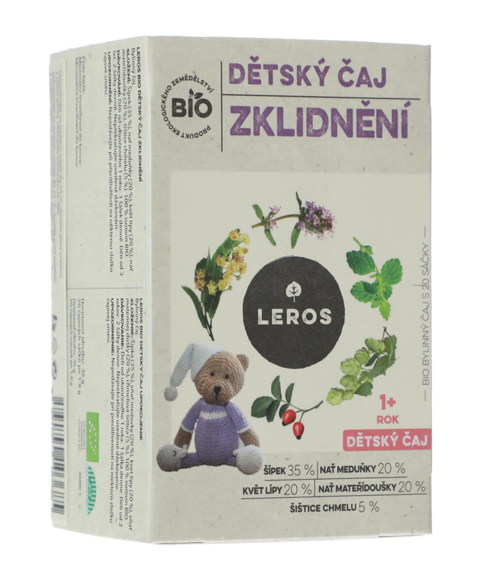 Dětský čaj na uklidnění od značky Leros napomáhá snažšímu usínání dítěte. Kombinace chmelu a meduňky uklidňuje organismus, lípa spolu se šípkem podporují jeho přirozenou obranyschopnost a voňavá mateřídouška s lípou přispívají ke správné funkci dýchacího systému.