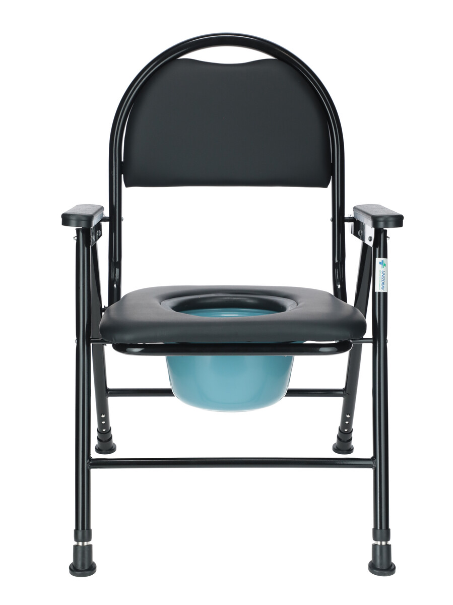 Toaletní židle skládací UNIZDRAV s hygienickým výřezem a plastovým kbelíkem slouží jako náhrada WC pro pacienty se sníživou pohyblivostí. Kbelík je vybavený poklopem, který zamezuje úniku nepříjemných zápachů. Nádobu je možné ze stoličky odebrat zespodu z přední strany židle.