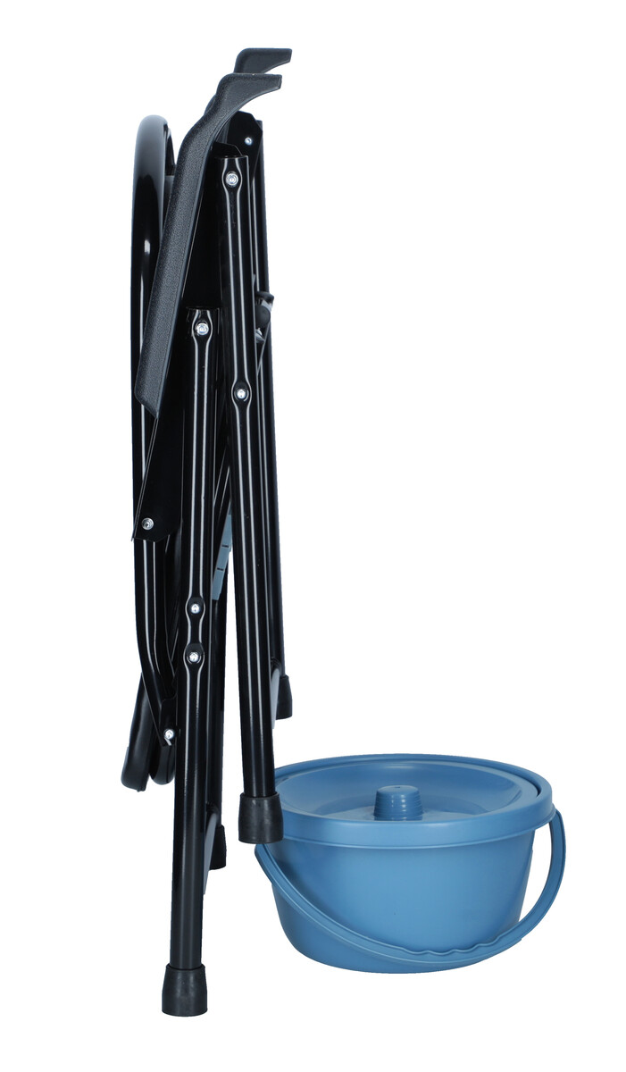 Skládací toaletní židle určená jako náhrada WC pro pacienty, kteří mají pohybové problémy.
