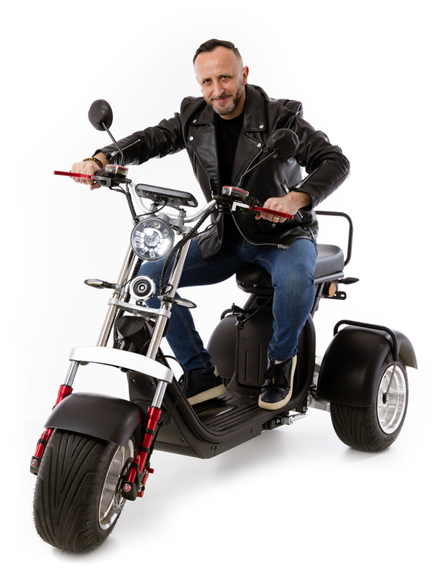 Stylový tříkolový elektrický skútr v ikonickém designu Choppra se systémem plynulého naklápění a odpružením kol zaručí jedinečný zážitek z každé jízdy.