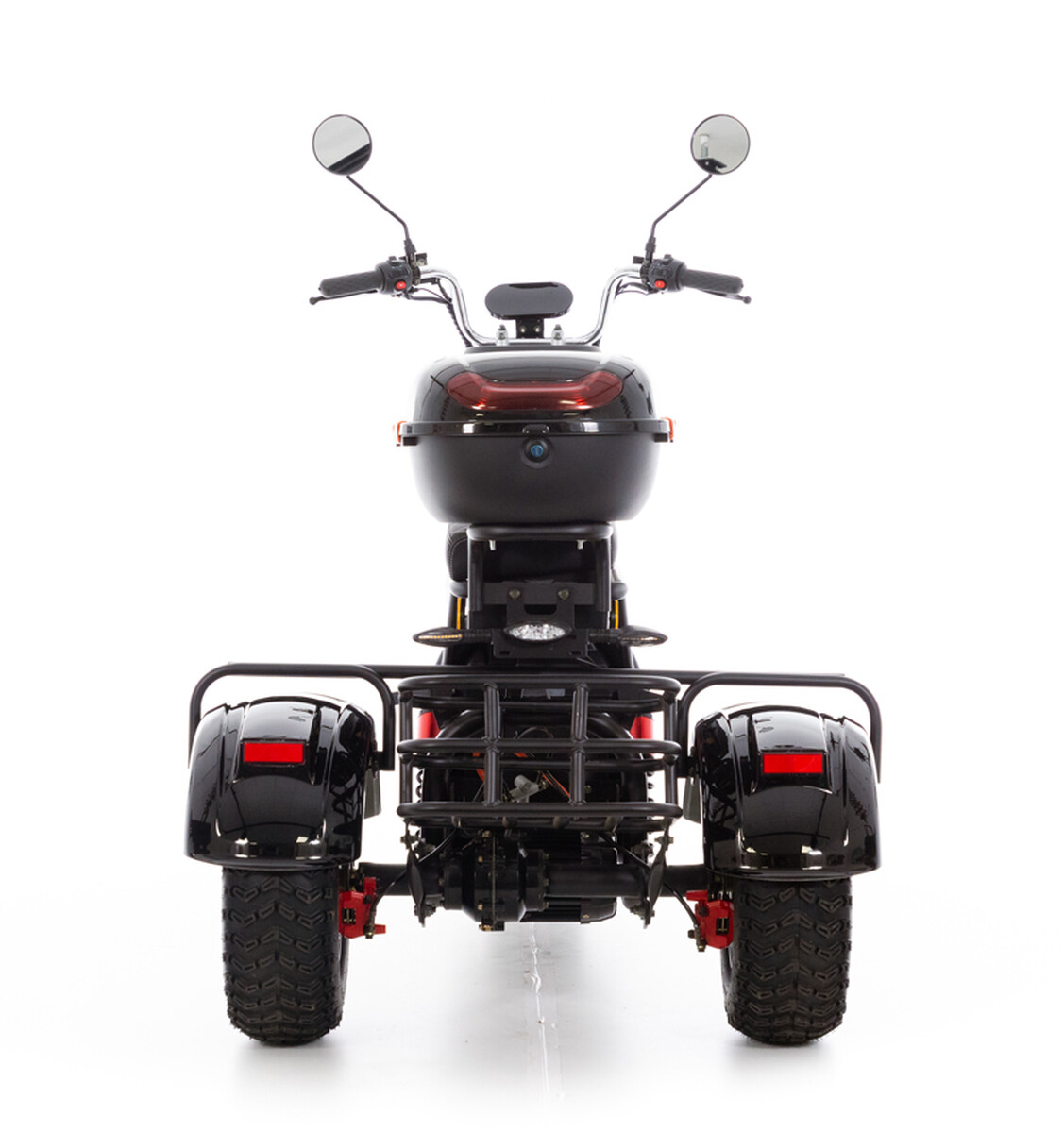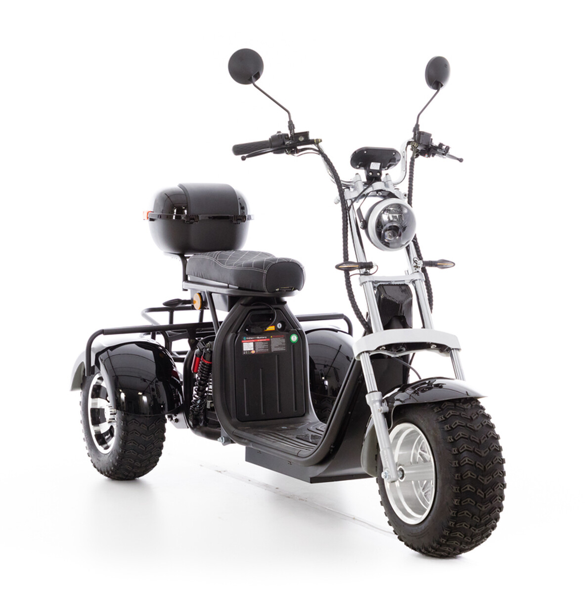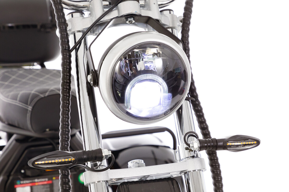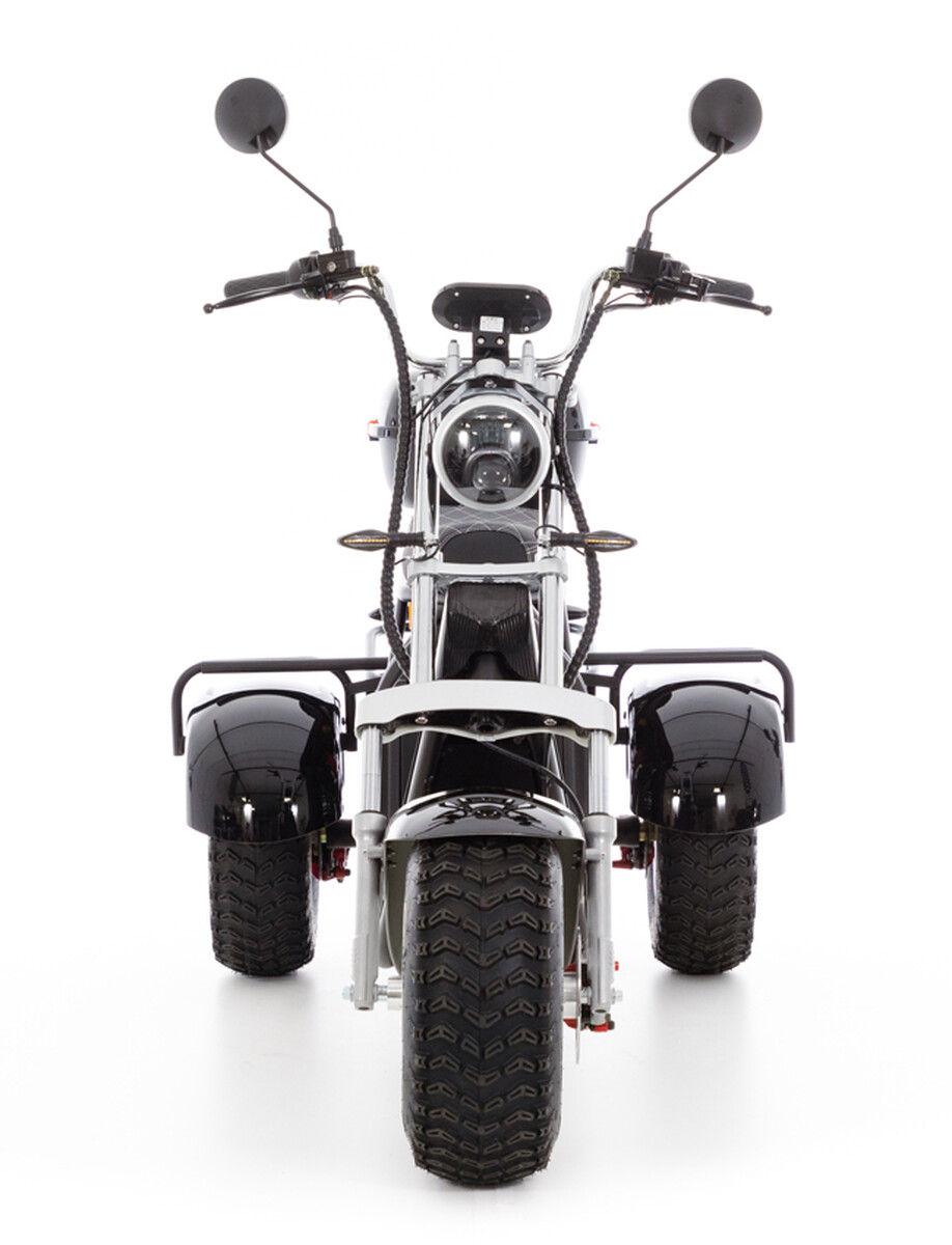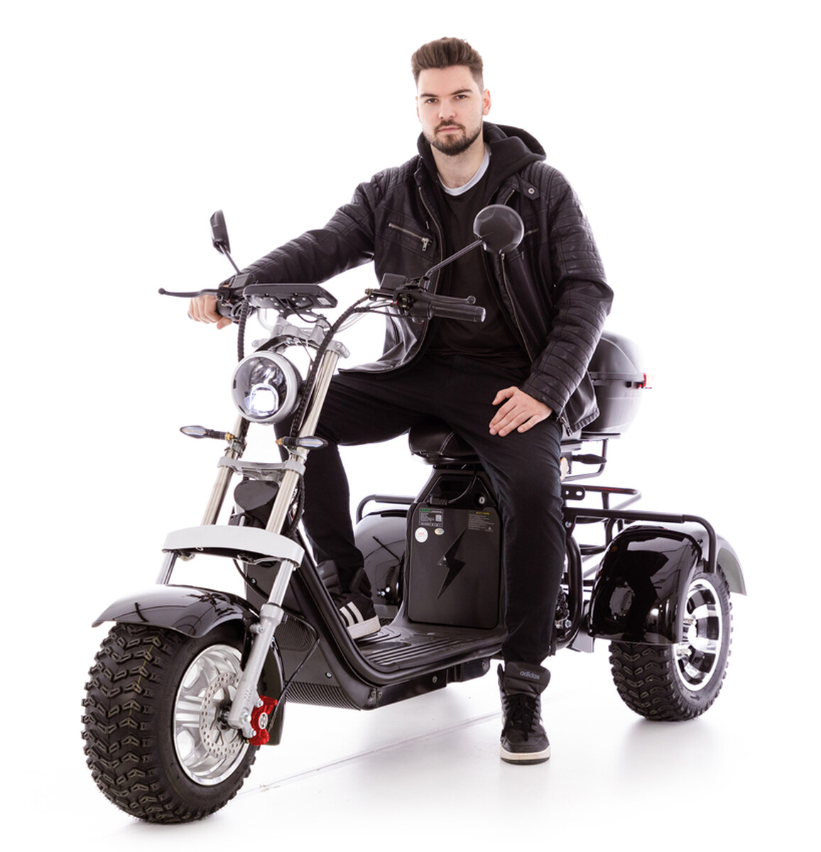 Designový a výkonný tříkolový skútr na styl motorky Chopper se silným motorem, zvýšenou stabilitou a dojezdem až do 70 km, vhodný pro dvě osoby.