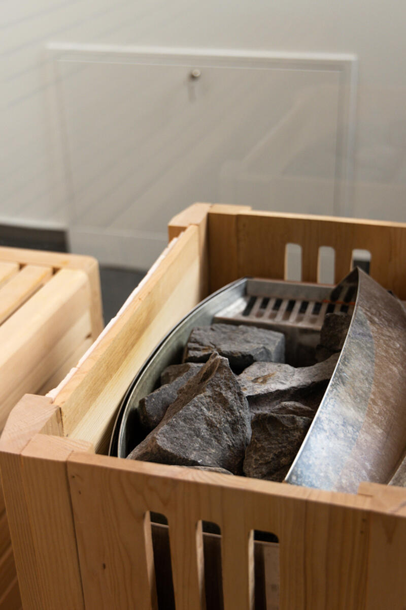 Interiér doplňuje dekorativní kamenný obklad na zadní stěně, který zvyšuje akumulaci tepla a zároveň podtrhuje prémiový charakter sauny. Kombinace přírodního dřeva, kamene a skla vytváří harmonický, nadčasový vzhled.