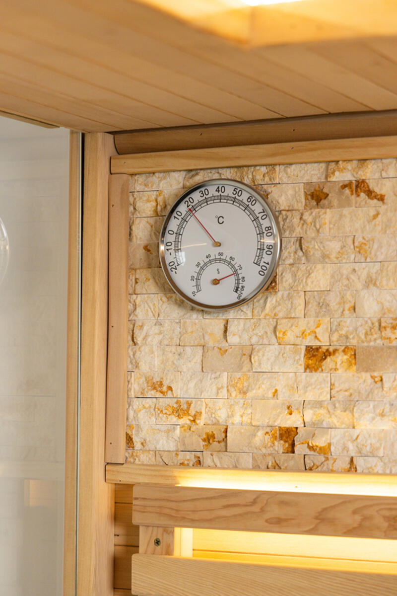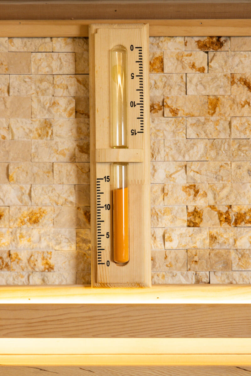 Sauna je vybavena všemi důležitými prvky pro bezpečné a pohodlné používánií – kombinovaný teploměr a vlhkoměr, přesýpací hodiny, dřevěný kbelík s naběračkou a osvětlení odolné vůči vysokým teplotám. Dvojitá střecha zlepšuje tepelnou izolaci, snižuje tepelné ztráty a přispívá k energeticky efektivnímu provozu.