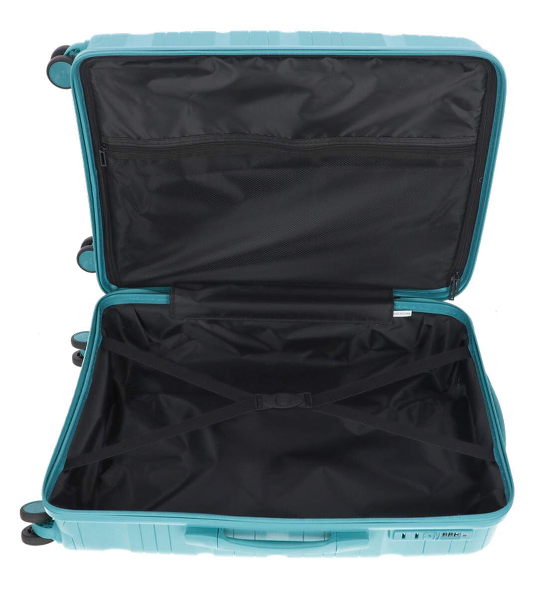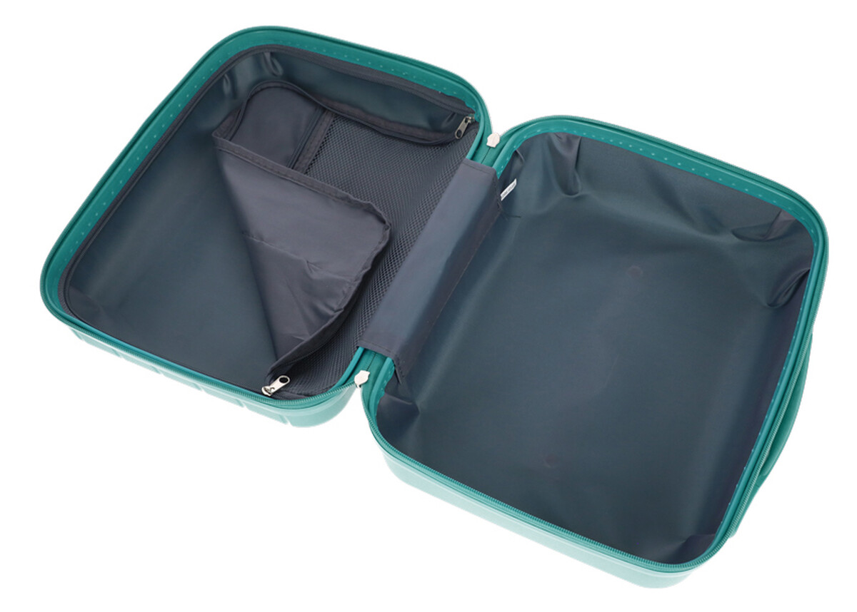 Interiér cestovního kufru je fuknčně rozdělený na dvě části. Jedna strana je vybavena elastickými křížovými popruhy a druhá strana celoplošným uzavíratelnou kapsou na zip a samostatnou síťovanou kapsou na drobnosti.