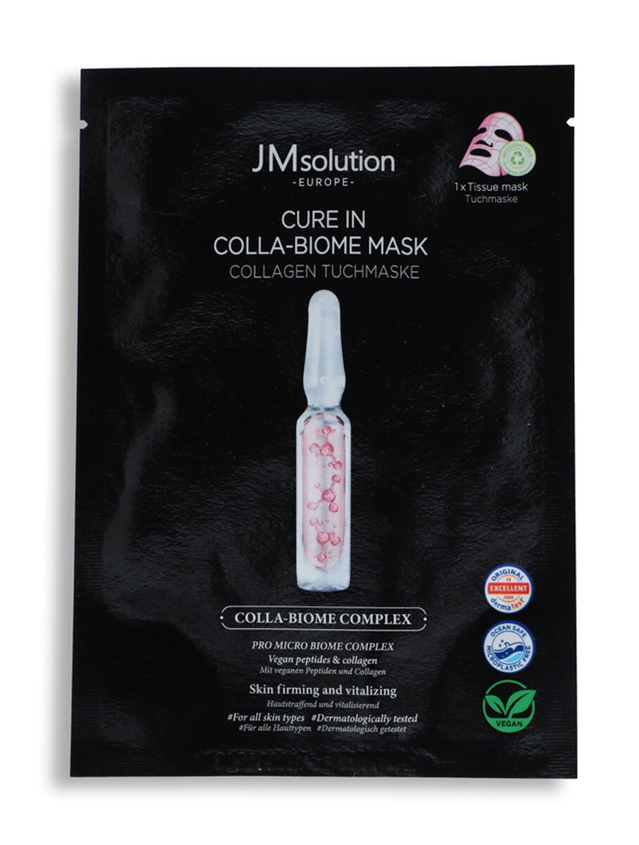 Kolagenová maska CURE IN COLLA-BIOME využíví biotechnologii, která spojuje veganské peptidy, fermentovaný kolagen a mikrobiomový komplex k dosažení viditelně pevnější, hydratované a zdravě vypadající pokožky. Spojení kolagenu, elastinu, myrothamnusového extraktu, prebiotik a probiotik zvyšuje elasticitu pokožky, obnovuje rovnováhu pleti a zabezpečuje hloubkovou hydrataci.