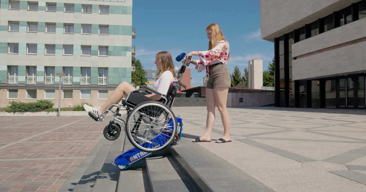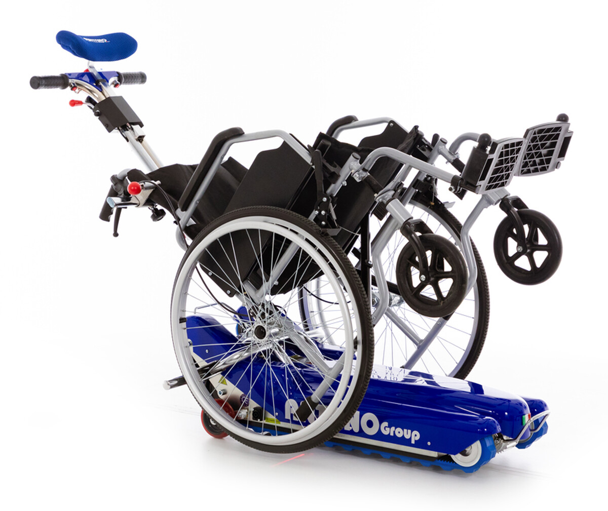 Přenosné zvedací zařízení pro bezpečný a pohodlný přesun pacientů po schodech v interiéru i exteriéru – bez nutnosti přesedání z vozíku na schodolez a zpět.