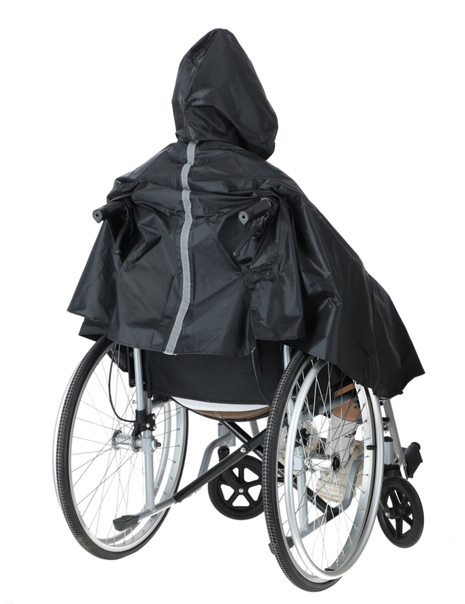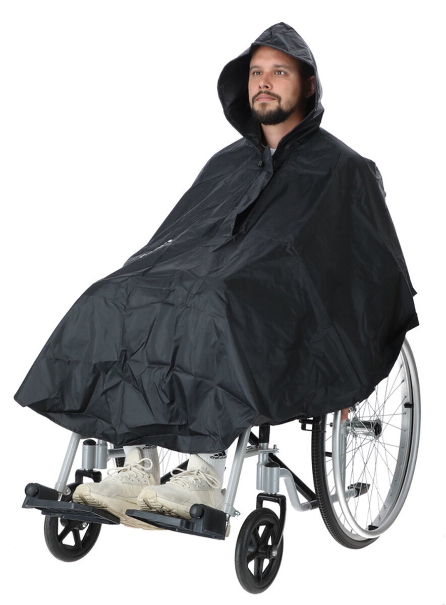 Nepromokavé pončo do deště s kapucí, speciálně navržené jako užitečný doplněk k invalidním vozíkům.