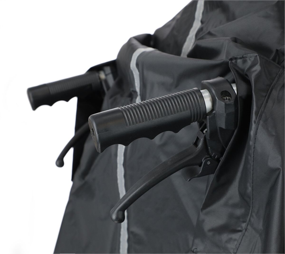 Pončo je možné zajistit o vozík pomocí otvorů na rukověti a dvou plastových klipů, které ho pevně přichytí ke konstrukci vozíku a zabrání jeho sesouvání během jízdy.