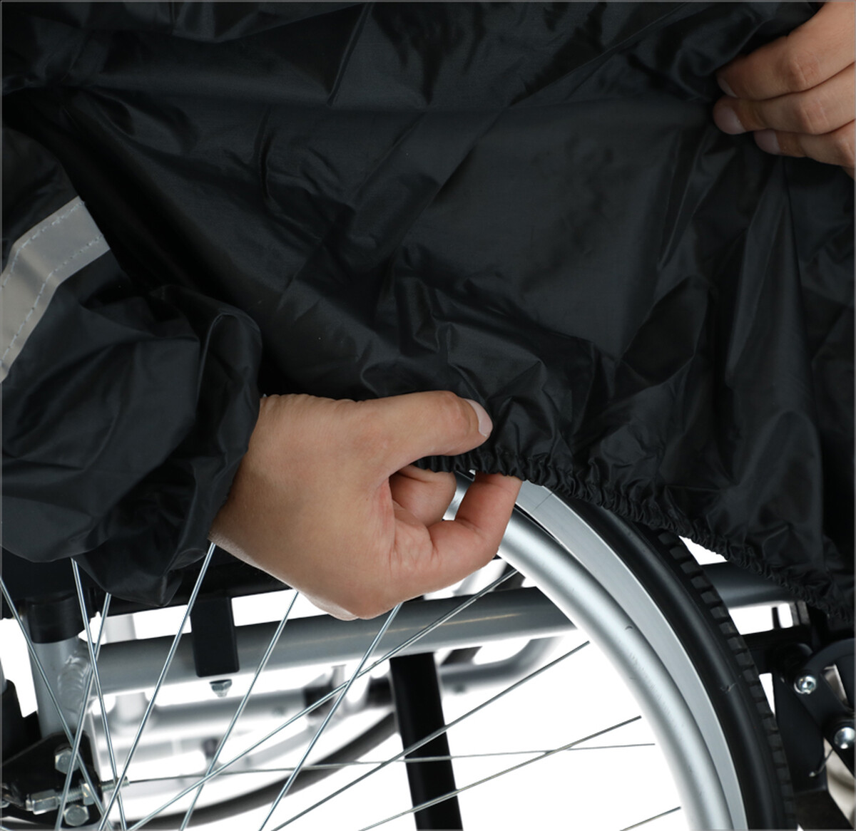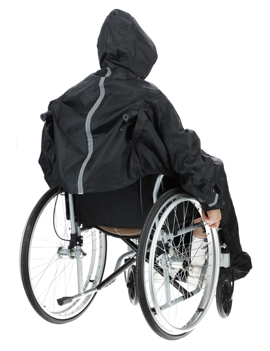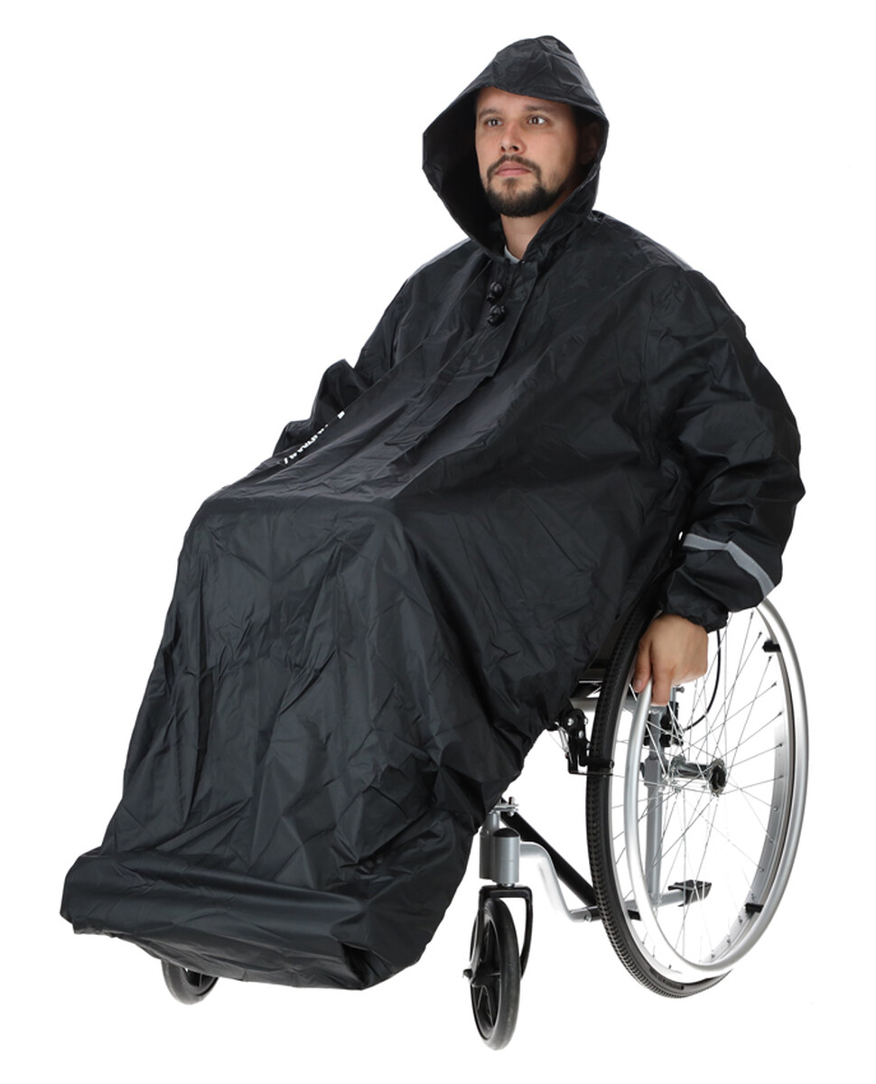 Nepromokavá pláštěnka s rukávy a kapucí, speciálně navržená jako užitečný doplněk k invalidním vozíkům.