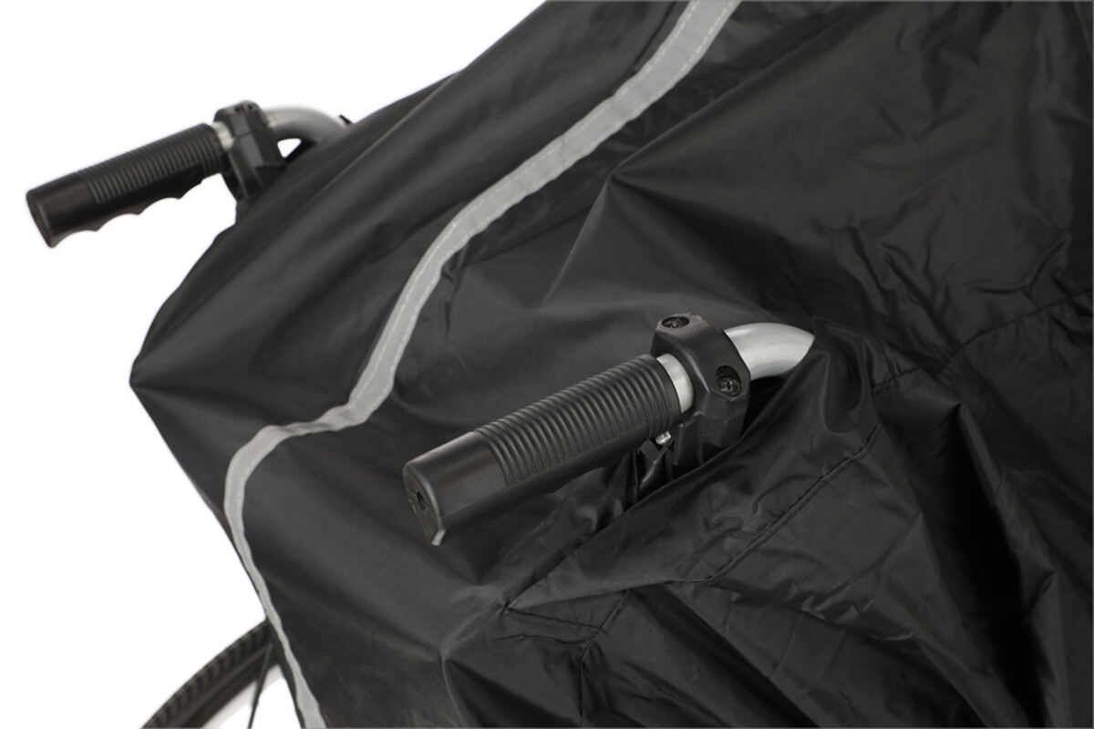 Pláštěnku je možné zajistit o vozík přes otvory na rukověti, které zabrání jeho sesouvání. Spodní část je po celém obvodu vybavená gumičkou, která obepne opěrky na nohy a spolehlivě udrží chodidla v suchu i při intenzivním dešti.