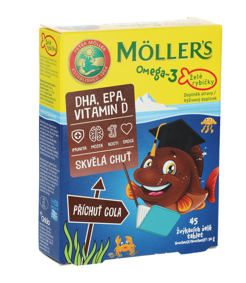 Želé rybičky značky Möller's obsahují kvalitní norský rybí olej z treščích jater, který je bohatým zdrojem omega-3 nenasycených mastných kyselin DHA a EPA a též přirozeně se vyskytujícího vitamínu D. Tyto látky hrají klíčovou roli při správném fungování buněk a celkového zdraví organismu, proto je jejich pravidelný příjem nezbytný.