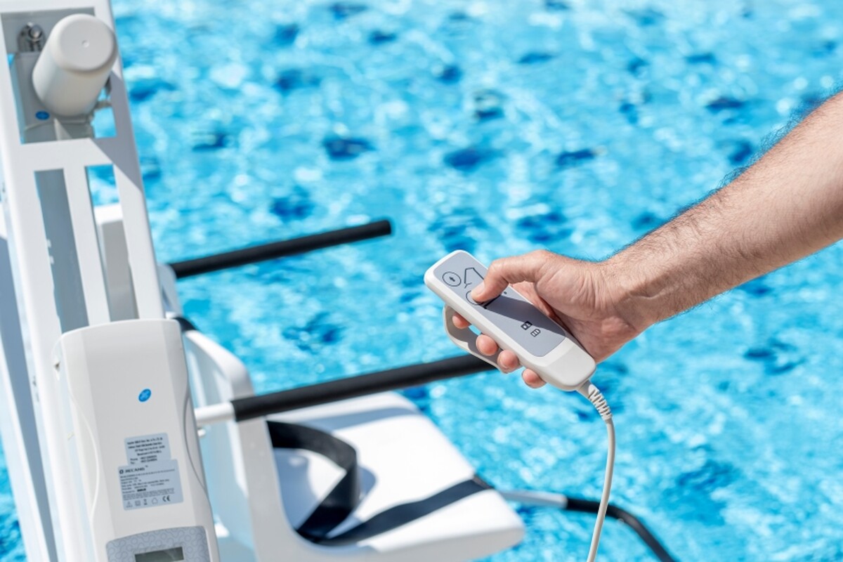 Intuitivní ovládání bazénového zvedáku umožňuje vodotěsný kabelový ovladač s jasně označenými tlačítkami. Pohyb zvedáku je plynulý, přesný a bez trhavých přechodů, což poskytuje uživateli i asistentovi jistotu během celého procesu spouštění a zvedání.