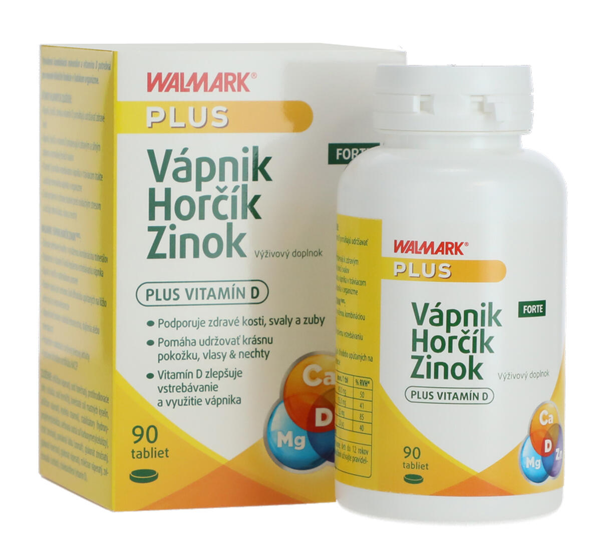 Doplněk stravy s obsahem vápníku, hořčíku, zinku a vitamínu D.