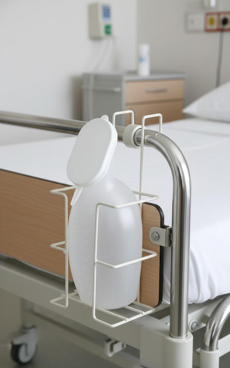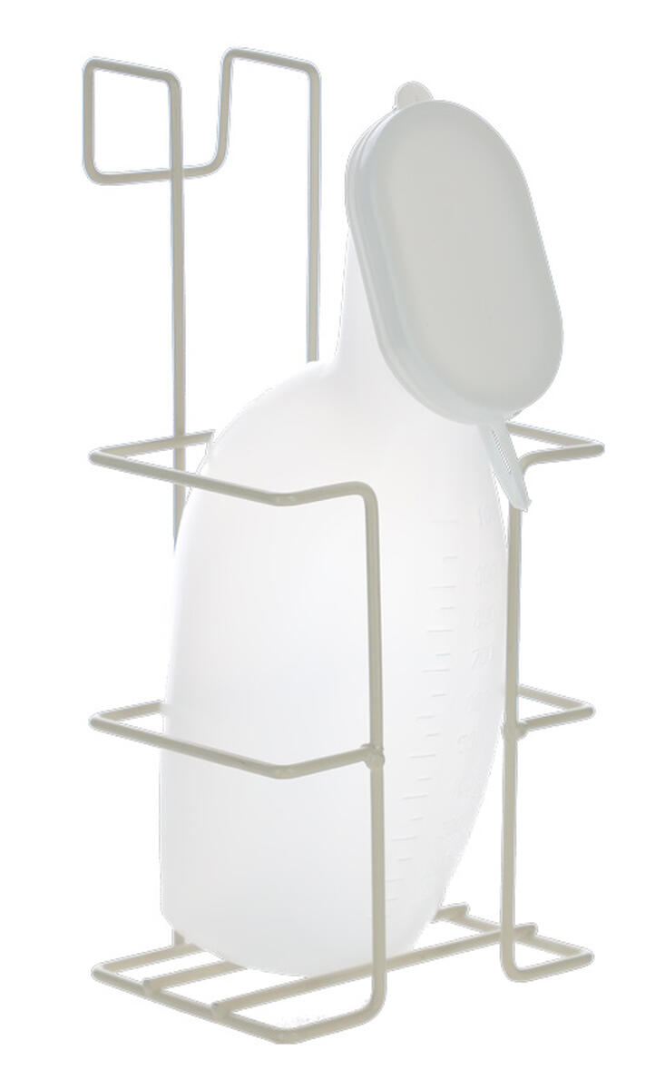 Závěsný držák na láhev na moč slouží k praktickému odkládání močových lahví. Konstrukce stojanu umožňuje jednoduché zavěšení na rám postele, kde bude vždy snadnodostupný.