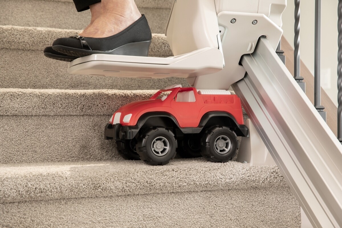 Nastupování a vystupování usnadňuje pohyblivé rameno sedačky – sedadlo lze otočit až o 90° směrem od schodů a zajistit ho do plně stabilní polohy mimo schodiště.