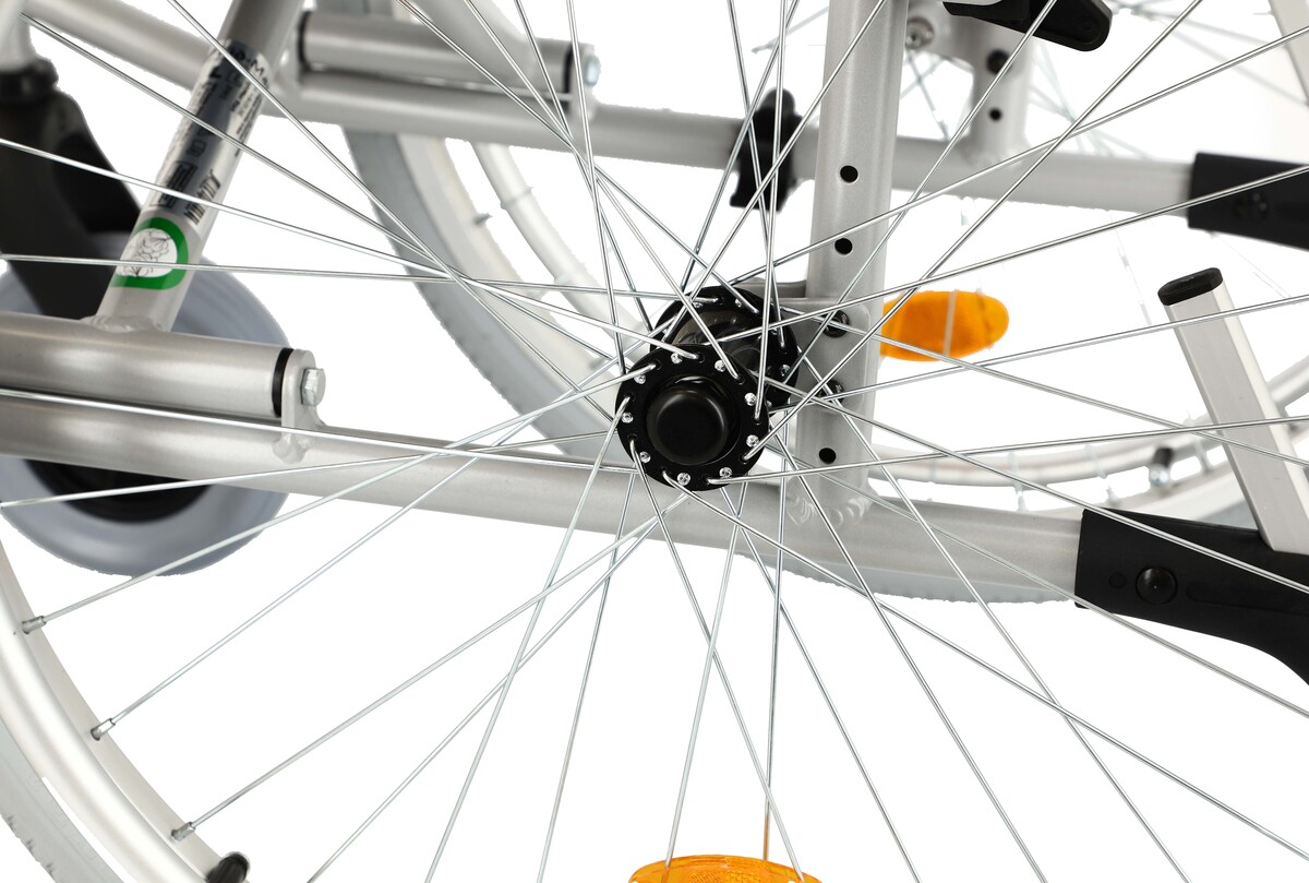 Přední kola jsou pevné, zadní pneumatické s kovovými hnacími obručemi. Pro zastavení vozíku je vpravo a vlevo před zadním kolem umístěna standardní přitlačovací parkovací brzda, která slouží k zajištění vozíku.