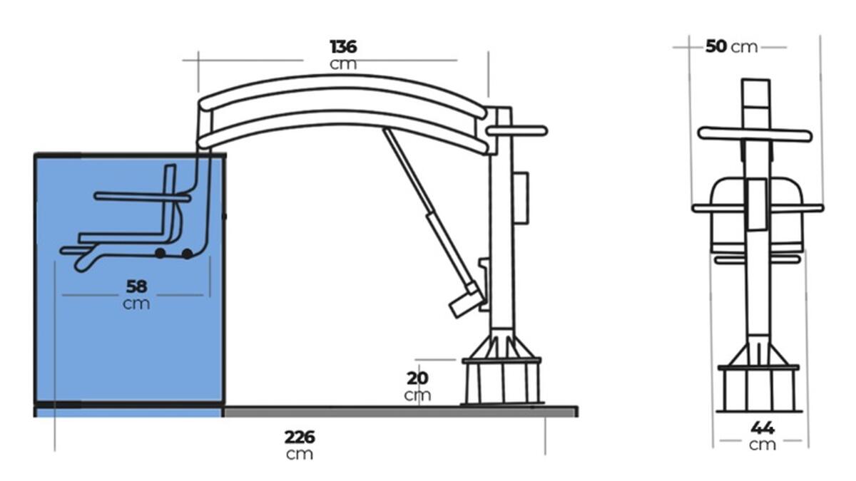 Konstrukce bazénového zvedáku Nart 300 je přizpůsobena bazénem se zvýšeným okrajem nebo specifickou stavební úpravou. Jeho zvedací rameno dokáže překonat výškový rozdíl až 140 cm, čímž umožní spolehlivý vstup do vody i při hlubších nebo architektonicky náročnějších bazénech.