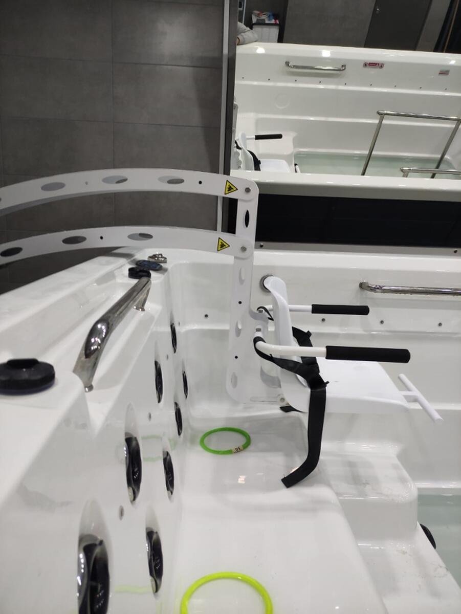Mokrému a kulzkému bazénovému prostředí jsou přizpůsobeny všechny komponenty zařízení. Samozřejmostí je ovladač s vodotěsnou úpravou, bezpečnostní pás, opěrky rukou, nastavitelná opěrka na nohy a též systém nouzového zastavení v případě nečakané situace.