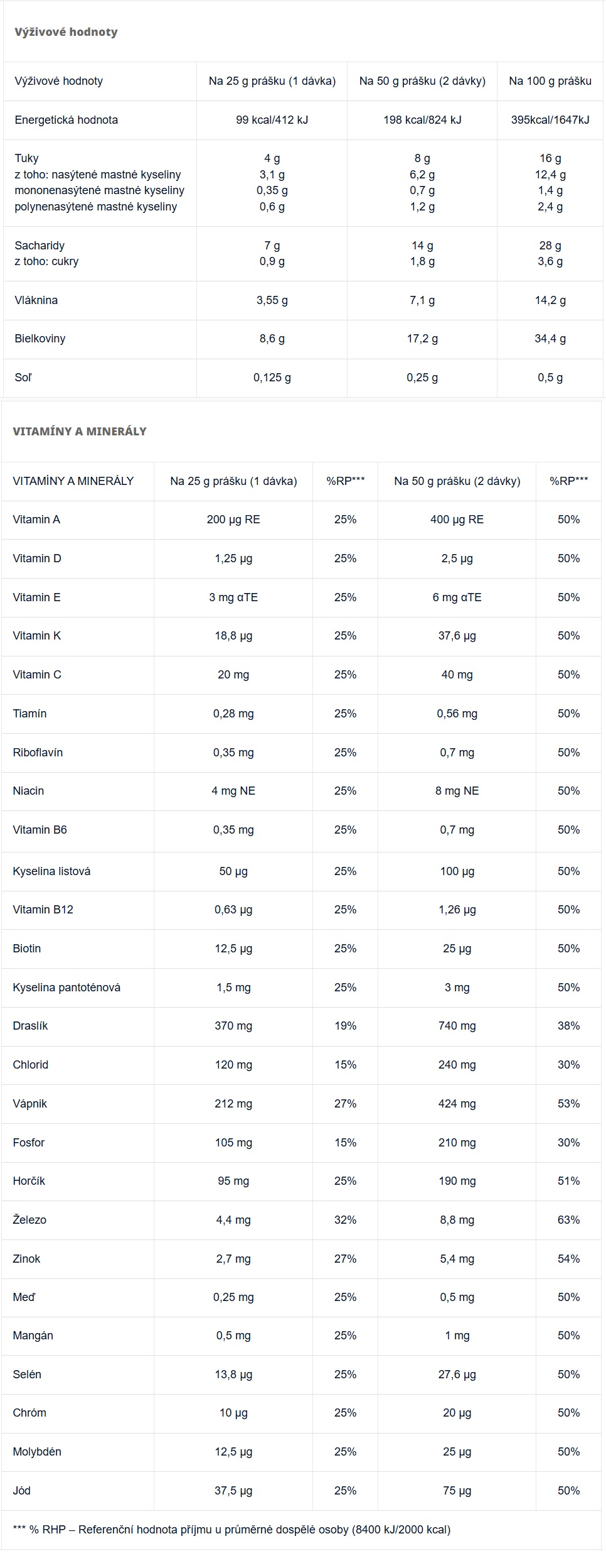 • rostlinné proteiny – kombinace kvasinkového proteinu a cizrnového proteinu poskytuje kompletní spektrum aminokyselin, tělu dodává důležité minerální látky a přispívá k pocitu sytosti